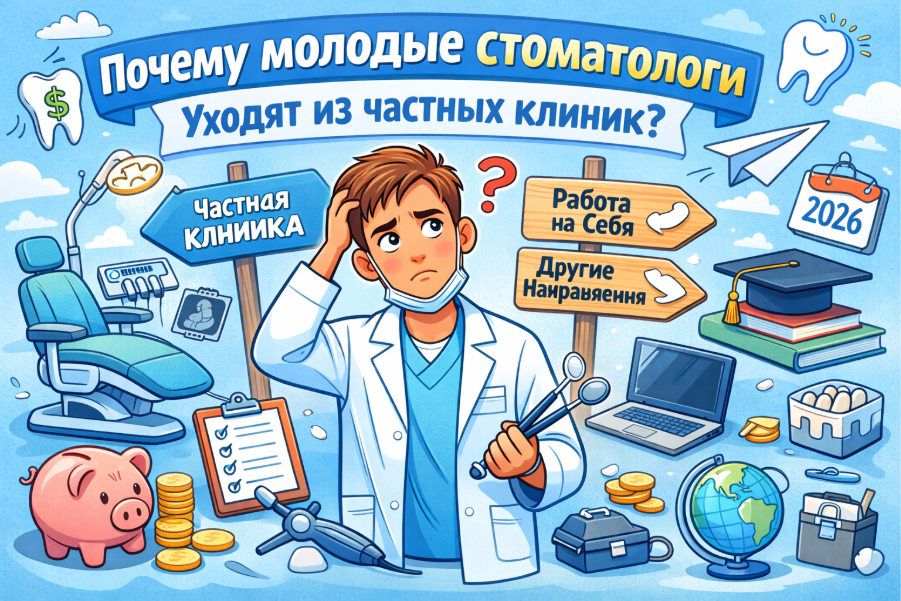 Выпускники стоматологических факультетов смотрят на частные клиники — и выбирают другое. Аренду кресла, работу на себя, смежные направления. Клиники удивляются: мы же предлагаем нормальные условия. Разбираю, почему молодые врачи голосуют ногами и что это означает для рынка в 2026 году.