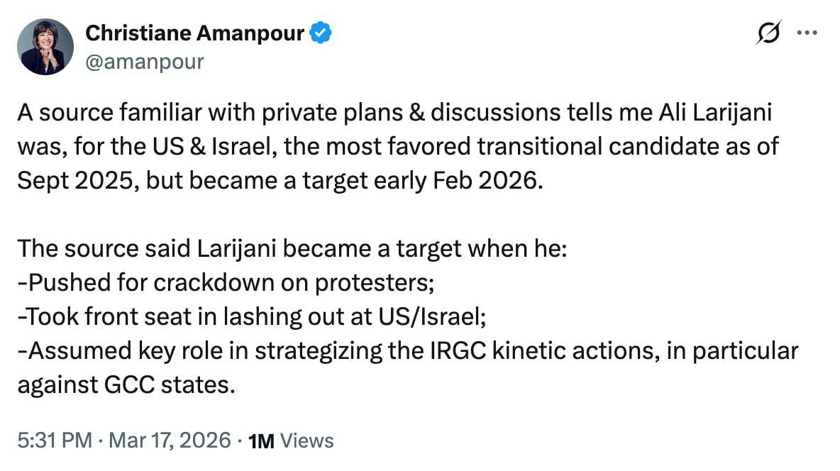 Кристиан Аманпур из CNN: Один осведомлённый источник, знакомый с секретными планами и переговорами, сообщил мне, что Али Лариджани до