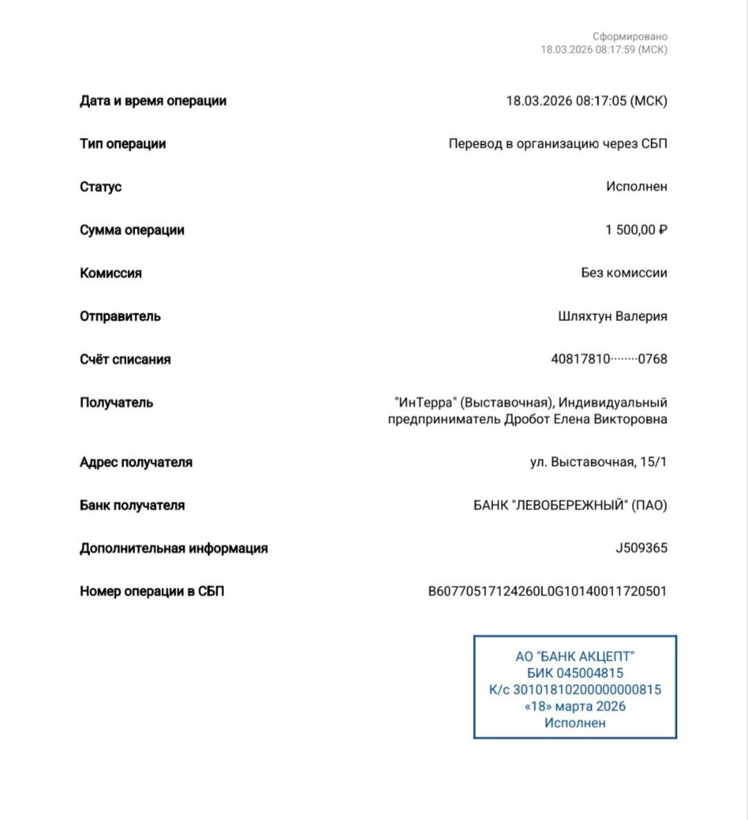 1500 ₽ улетели в "ИнТерру" на Выставочную в счёт оплаты долга ❤️🩹 Немного, но с вашей помощью удалось набрать, и хоть как-то исправить