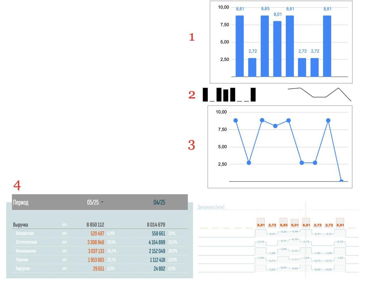 ? ➡️ Один из удобных вариантов отражения динамики выручки и/или поступления денежных средств (да и в принципе иных статей) представлен на изображении (вариант 4). Как обычно делают? 1️⃣ Типовая гистограмма Делается просто, но выглядит немного нелепо без визуальных настроек. С ними — самый рабочий вариант. 2️⃣ Спарклайн Но его сложно настроить хорошо, сложно вместить в ячейку, там нет чисел, а их хочется видеть. 3️⃣ Обычный график Можно, но не так наглядно для сравнения абсолютных величин. Что я предлагаю ⤵️ Цифры за год, текущий/прошлый месяц или план-факт оставляем в левой части экрана. Динамику организуем помесячно в виде графика на уровне высоты 1-2 ячеек, добавляем цифры и убираем заливку, оставляя контуры. ✨ Получается интересный вариант: живая, воздушная графика — и пики/провалы видны, и картинку не перегружаем, и абсолютные значения тоже видим. Какой вариант выбираете вы? 🎁 Получить в подарок логическую карту по финансам в бизнесе на e-mail 📺 YOUTUBE | 📺 RUTUBE
