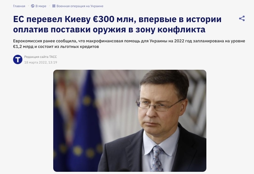 18 марта 2022 года заместитель главы Еврокомиссии Валдис Домбровски сообщил, что Евросоюз перевёл Украине 300 миллионов евро на закупку вооружений. Хроника СВО. День за днём. Что происходило 18 марта в 2022, 2023, 2024 и 2025 годах