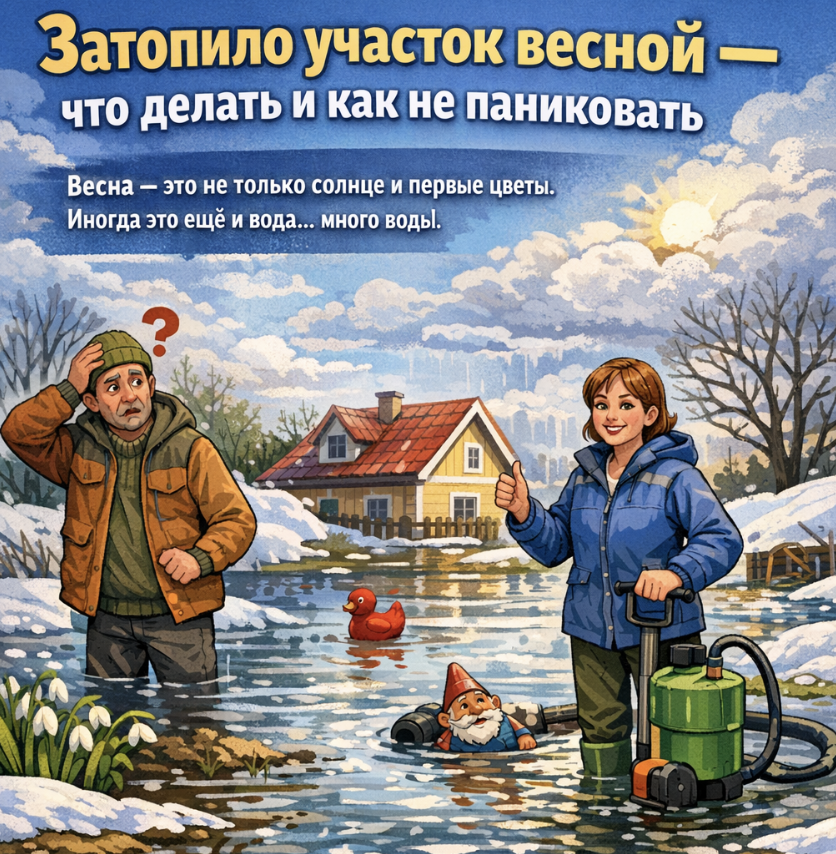 Иногда это ещё и вода… много воды. Снег тает, грунт не успевает впитывать влагу, и участок превращается в маленькое озеро. Если вы столкнулись с этим впервые — главное не паниковать.