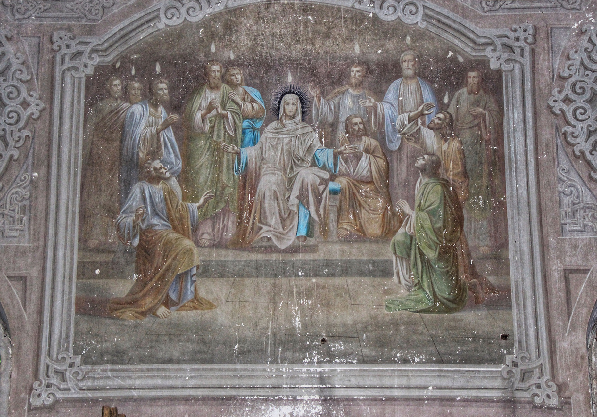 Затхлый запах сена и дерева вырвался на свободу, стоило мне распахнуть створку двери. Один двор точно был жилым, но мне так никто и не встретился. Прежде всего, Смоленская церковь запомнилась приятным монохромом сохранившихся росписей («Сошествие Святого духа на апостолов», «Моление о чаше», Образ Спаса, «Нагорная проповедь», «Ужин в Эммаусе», «Иисус Христос в Гефсиманском саду», Образ Бога Саваофа и др.). Неровный пол был устлан сеном, приходилось маневрировать между снопов, наступая на продавленные доски.