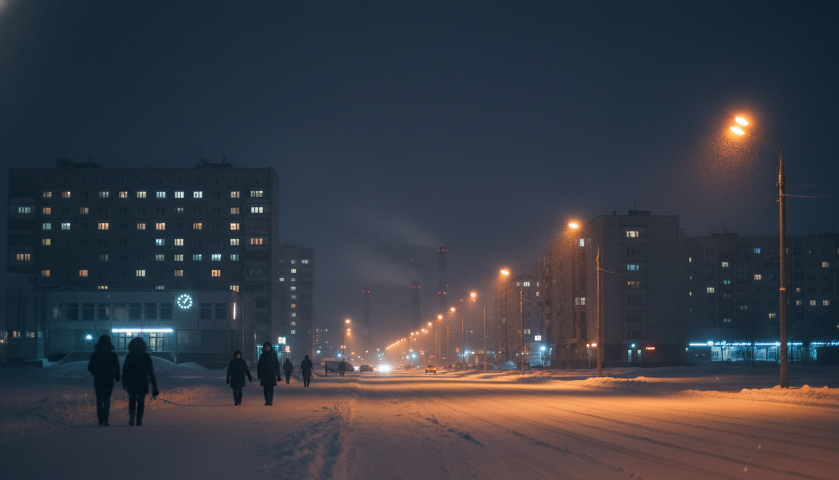 Первое заблуждение, которое я привёз с собой: полярная ночь означает абсолютную темноту круглые сутки. Это не так. В Норильске, который находится на 69-й параллели, солнце не поднимается над горизонтом примерно 45 дней подряд. Полная темнота? Не совсем. Около полудня бывает так называемый «полярный полдень»: на горизонте появляется слабая синеватая полоса. Не свет, а скорее намёк на него. Длится это минут сорок, потом снова темнеет.