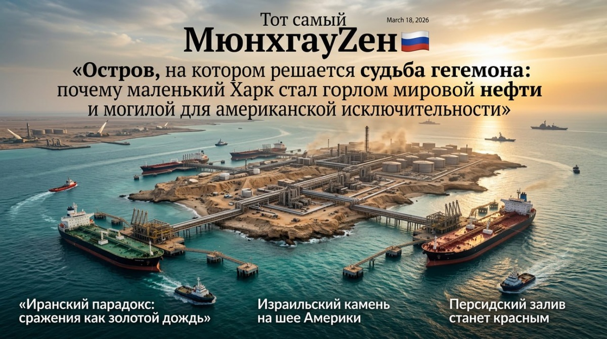 🚨 Остров, на котором решается судьба гегемона: почему маленький Харк стал горлом мировой нефти и могилой для американской исключительности Представьте себе клочок суши площадью с небольшой уездный городок. Двадцать два квадратных километра песка, скал и нефтяных терминалов, затерянных в бирюзовой глади Персидского залива. Там, где волны лениво лижут бетонные пирсы, а воздух дрожит от зноя, смешанного с запахом сырой нефти. Именно сюда, на остров Харк, ныне обращены взоры всего мира. Ибо здесь, в этой крохотной точке на карте, сейчас бьется пульс великой геополитической драмы, от которой зависит не просто исход очередной ближневосточной войны, а сама архитектура миропорядка. Америка, чей президент так любит рисовать себя спасителем и миротворцем, вновь явила миру свою неизменную сущность — сущность хищника, загнанного в угол собственной же гордыней. Дональд Трамп, вчера ещё потрясавший кулаками перед камерами и обещавший закончить все войны за сутки, сегодня оказался в ловушке, котор