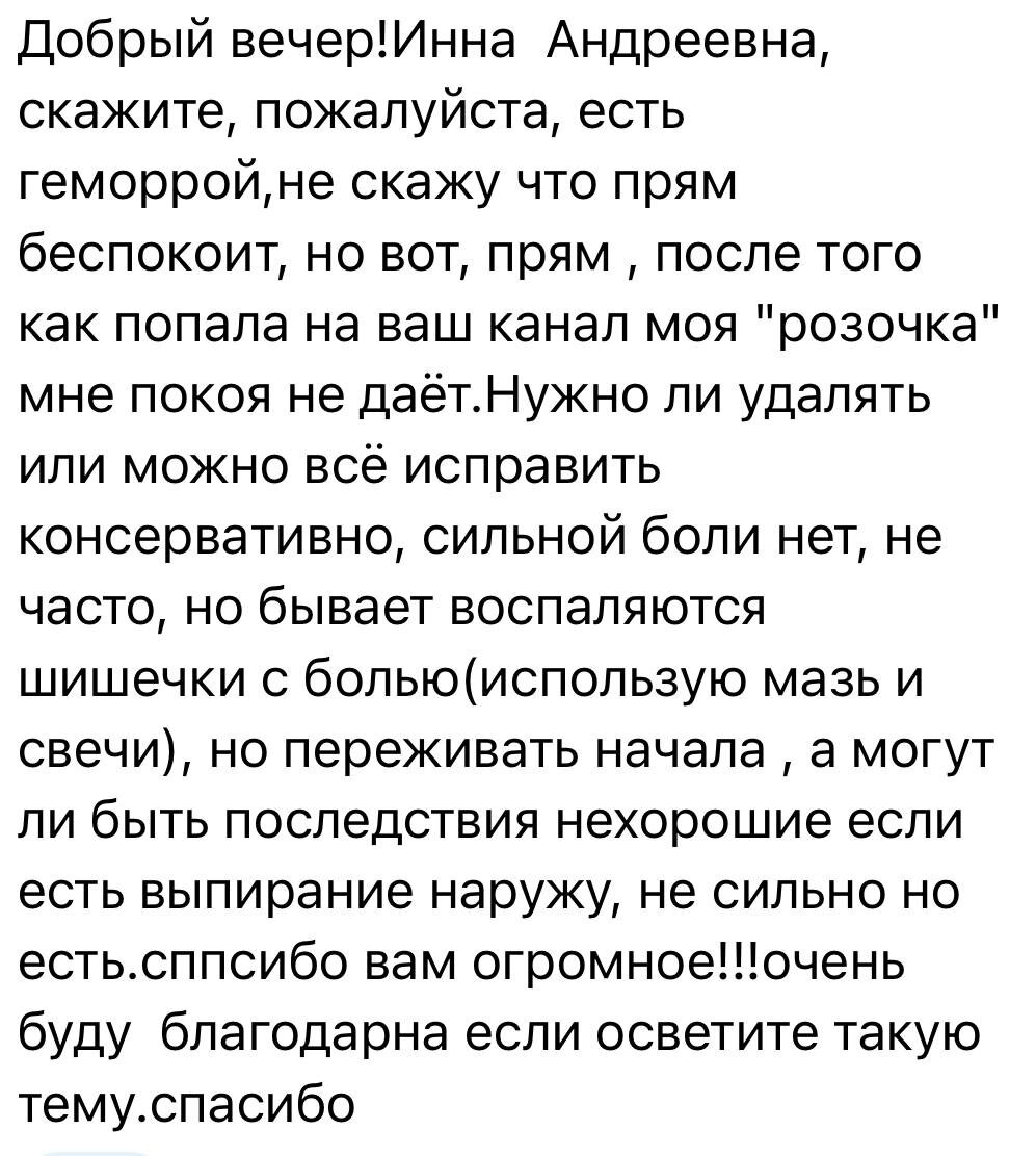 Добрый вечер! Инна Андреевна, скажите, пожалуйста, есть геморрой, не скажу что прям беспокоит, но вот, прям , после того как попала на ваш канал моя "розочка" мне покоя не даёт. Нужно ли удалять или можно всё исправить консервативно, сильной боли нет, не часто, но бывает восплаляются шишечки с болью(использую мазь и свечи), но переживать начала , а могут ли быть последствия нехорошие если есть выпирание наружу, не сильно но есть. сппсибо вам огромное!!! очень буду благодарна если осветите такую тему. спасибо Многие люди годами живут с геморроем. Оставляют тысячи рублей в аптеках, покупая свечи, мази, таблетки, но очередное обострение почему-то не заставляет себя ждать, причем случается оно внезапно: в отпуске, в командировке, перед важным мероприятием. Логично, что возникает желание решить вопрос радикально – удалить геморроидальные узлы и избавиться от проблемы. Геморроидальные узлы у нас с рождения. То есть это не приобретённая, а врождённая ткань. Одна из функций геморроидальных