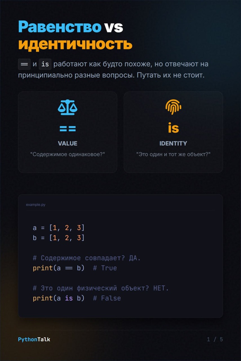 В карточках читайте о разнице между равенством и идентичностью и как интернирование может вас обмануть 🧠