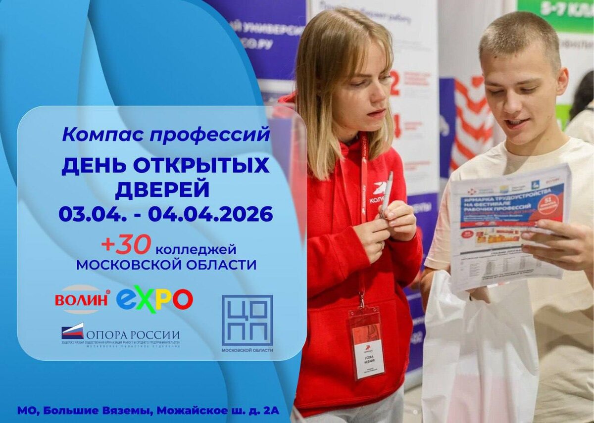 ? Есть решение! Приглашаем на Дни открытых дверей 30 колледжей Московской области. 📆 Дата: 3–4 апреля Время: с 10 до 15 часов 📎Место: культурно-выставочный центр «ВОЛИН ЭКСПО» Московская область, Одинцовский г.о., р.п. Большие Вяземы, Можайское ш.д. 2А Это отличная возможность для школьников и родителей познакомиться с современными профессиями и получить консультацию из первых уст. Что вас ждёт на площадке: 🔻Мастер-классы в разных профессиях — от технических и IT-направлений до творческих и сервисных специальностей; ✔️Возможность познакомиться с преподавателями и пообщаться студентами колледжей, узнать всё оо условиях поступлении и образовательных программах; ✔️Пройти профориентационные активности и понять, что действительно интересно; 🔻Целевое обучение от работодателей с прямым трудоустройством; ✔️Временная подработка на каникулах и многое полезное. Вы сможете буквально «потрогать» будущую профессию своими руками и понять, какое направление интересно и подходит именно ва