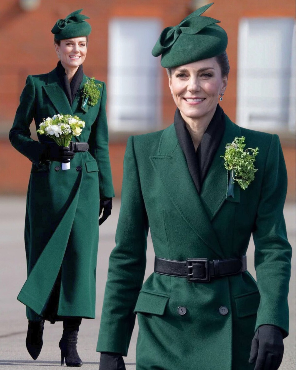 Кейт Миддлтон появилась на параде в честь Дня Святого Патрика в образе, который сразу привлекает внимание: с головы до ног в глубоком изумрудном. Двубортное пальто Alexander McQueen с заострёнными лацканами и двубортной, подчёркнутое чёрным ремнём, создаёт строгость силуэта и уверенность в образе. Под пальто длинное плиссированное платье McQueen с трикотажным лифом и плиссированной юбкой,