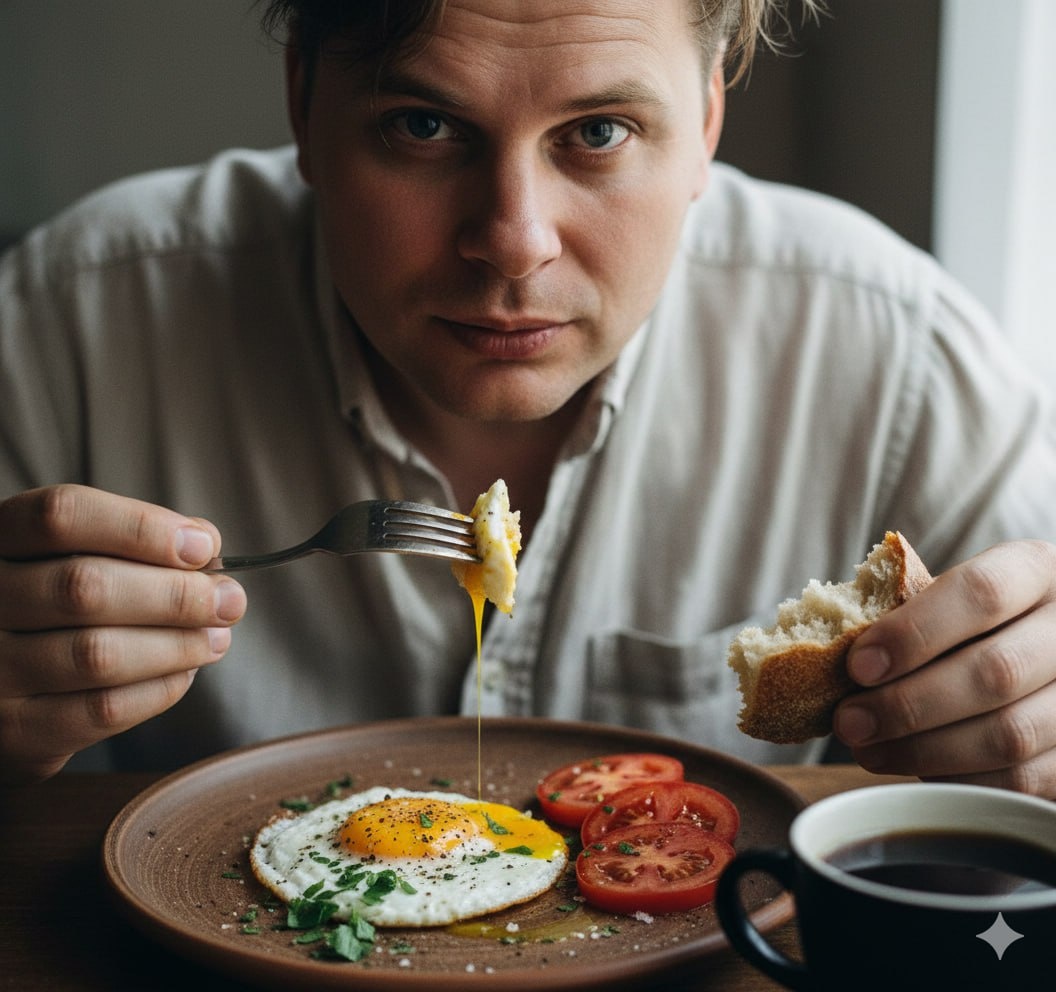 Сегодня, 18 марта, отмечается Всемирный день яичницы. Так выпьем же за то, чтобы дефицит яиц никогда не настал! :) воссоздай внешность мужчины с загруженных референсных фотографий, точно сохранив черты его лица — форму глаз, нос, губы, скулы и общий облик. сцена глубокий макро-портрет, снятый с очень близкого расстояния. мужчина ест яичницу-глазунью из глиняной тарелки в мягком утреннем свете. персонаж растрёпанные волосы после сна, лёгкие следы усталости под глазами. мягкая льняная рубашка. взгляд направлен прямо в кадр — он полностью поглощён едой. действие в одной руке — вилка с кусочком яичницы на зубцах. другая рука придерживает ломоть хлеба. рот слегка приоткрыт. еда и детали на тарелке фотореалистичная яичница крупным планом: жидкий желток растекается по хрустящим белкам, посыпанным чёрным перцем, солью и свежей зеленью. рядом — спелый помидор, нарезанный дольками, его сок смешивается с желтком. сбоку стоит чашка тёмного кофе с лёгким паром. текстуры и материалы неровная т