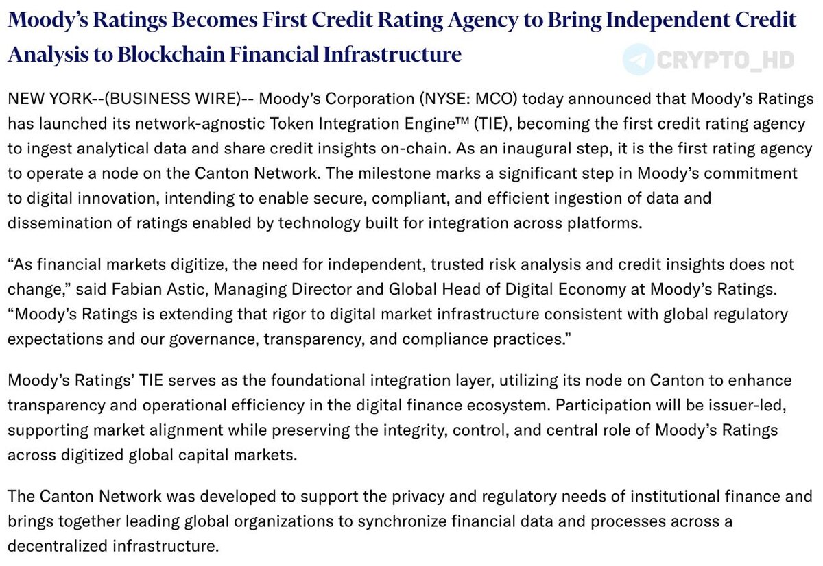 📊 Moody’s переводит кредитные рейтинги в блокчейн благодаря интеграции с Canton Network. Решение ориентировано на институциональных участников и встраивается в финансовую инфраструктуру. В Moody’s уже запустили собственную ноду и планируют расширение на другие сети. Ранее: - самый институциональный блокчейн - JPMorgan - DTCC Crypto Headlines