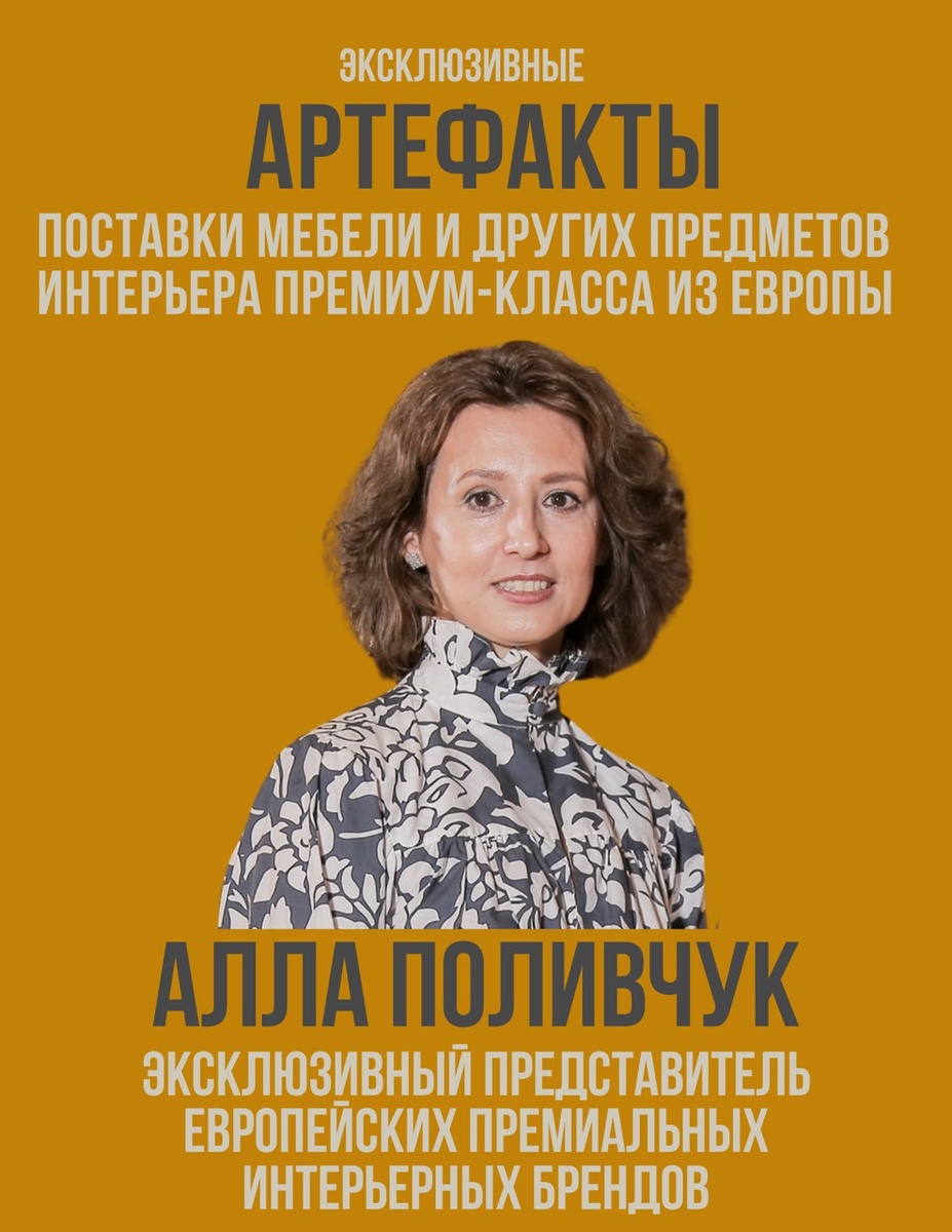 Алла Поливчук — предприниматель, официальный и эксклюзивный представитель европейских премиальных интерьерных брендов, производителей высококачественной продукции для внутренней отделки: сантехники, мебели для жилых и общественных пространств, ковров, освещения. Работает напрямую с ведущими европейскими фабриками, обеспечивая комплектацию интерьеров, подбор и быструю доставку эксклюзивных предметов интерьера. Индивидуальный подход, оптимизация стоимости заказов и персональный дизайн-проект позволяют реализовать проекты любой сложности — от частных резиденций до общественных пространств. Артефакты, которые формируют пространство и статус. Контакты по запросу.