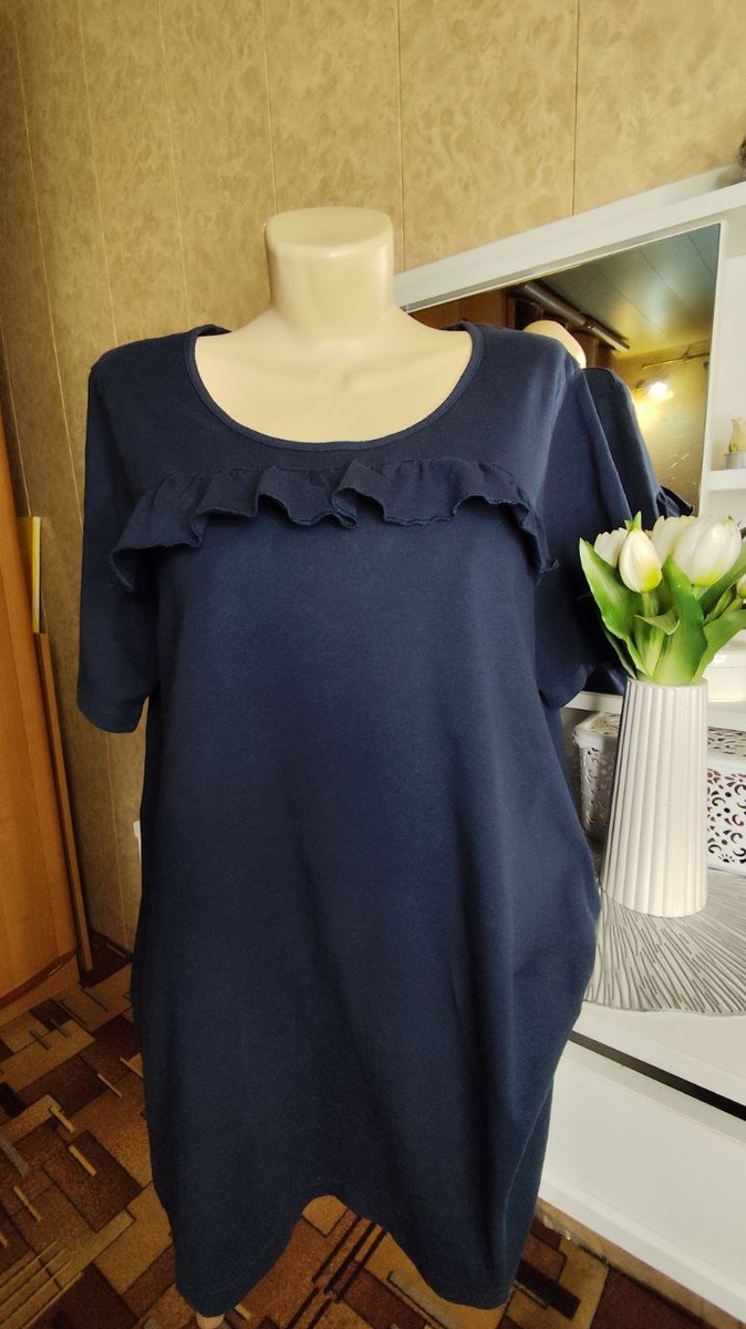 100% хлопок. Спереди кокетка и рюшка Очень хорошо сидит по фигуре. За счёт плотного трикотажа хорошо держит форму. Крой не прямой. К низу немного расклёшенная, поэтому красиво сидит по фигуре. Размер XL 48/50 Длина - 74 см ПОГ - 59 см Ширина по низу - 64 см Длина рукава - 24 см Ширина рукава - 17 см Состояние идеальное Цена 800 рублей + пересылка
