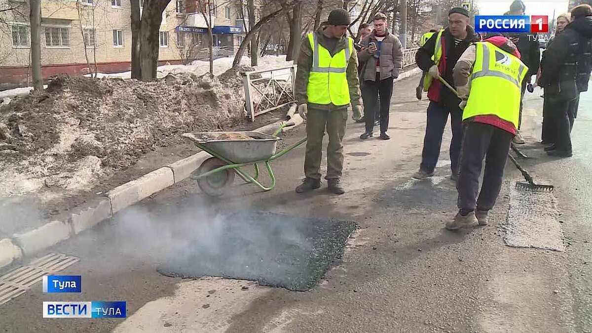 С наступлением весны в Туле просыпаются не только почки на деревьях, но и дорожные рабочие. Вот и здесь, на улице Фрунзе ремонт идёт полным ходом. Сначала формируют так называемые «дорожные карты», выдувают из них весь мелкий мусор и влагу, а уже потом получившиеся выемки заполняют литым асфальтом. По словам директора организации-подрядчика Марка Желтикова, «для восстановительно-ямочного ремонта при пониженной температуре используем литой асфальтобетон. Остановиться не можем, а горячим работать пока невозможно». В результате работ получается вот такой асфальтовый пирог, можно даже увидеть, как он до сих пор дымится – как говорится, с пылу, с жару. А сверху его посыпают известковым отсевом – это нужно для лучшего сцепления на дороге. Застывает эта тягучая чёрная масса всего за три часа. А гарантия на ремонт, по словам дорожников, от 1 года до 3 лет. Вот только это не объясняет, почему на улицах Тулы снова и снова образуются ямы. Спрашиваем у администрации города. Как рассказал начальник