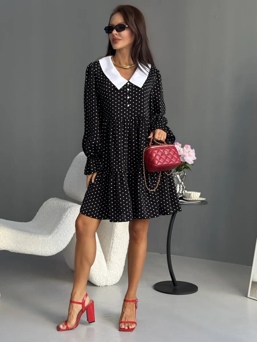 Воздушное и романтичное платье с принтом в горошек — воланы и ярусное исполнение создают лёгкий и нарядный образ. Завязки на груди, широкий белый воротник, объёмные рукава. Длина чуть выше колен, крой оверсайз.