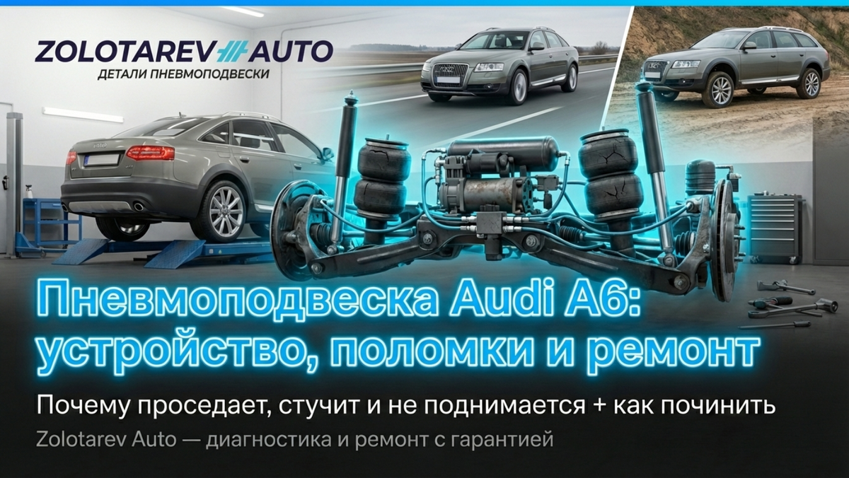 Пневмоподвеска на Audi A6 - комфорт на трассе и проходимость на бездорожье. Регулирует клиренс, жесткость и уровень кузова. Стоит на A6 C5 Allroad (1999-2005), C6 Allroad (2006-2011), C7 Allroad (2011-2018) и частично на C8 (2018+). В России пневма требует ухода: плохие дороги, соль и влажность ускоряют износ. При пробеге 150-200 тыс. км часто падает на бок, стучит, выдаёт ошибки или медленно поднимается. C5 Allroad: только задняя ось, компрессор Wabco, баллоны слабые - рвутся от соли. Пробег до проблем 150-200 тыс. км. C6 Allroad: передняя и задняя пневма, компрессор AMK/Wabco. Штуцеры коррозируют. Ошибки C1046, C1047. Пробег до ремонта 180-250 тыс. км. C7 Allroad: улучшенная система, компрессор Hitachi/AMK. Баллоны усиленные. Проблемы: утечки в баллонах и клапанах. Пробег 200-300 тыс. км. C8: адаптивная пневма с предиктивной регулировкой. Компрессор в багажнике. Надёжнее, но ремонт дороже. Проблемы после 150-200 тыс. км. 1. Утечка в пневмобаллонах Падает на бок за ночь, шипение, низк