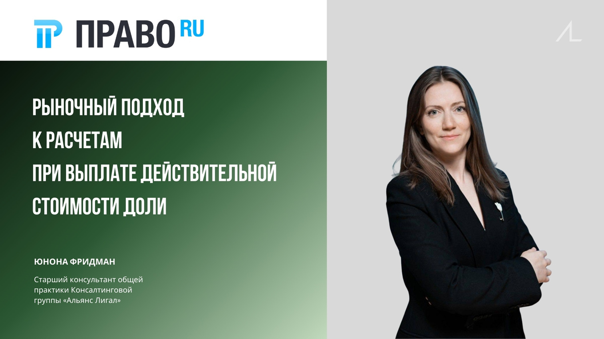 На правовом портале «Право.ru» опубликована статья Юноны Фридман, старшего консультанта общей практики Консалтинговой группы «Альянс Лигал» С 28 декабря 2025 года вступили в силу положения Федерального закона от 28.12.2025 № 514, которым внесены изменения в Федеральный закон «Об обществах с ограниченной ответственностью». Эти изменения затрагивают важный аспект деятельности обществ — определение действительной стоимости доли при выходе участника из общества, его исключении из общества, переходе доли от наследников к обществу, обращении взыскания на долю участника-должника, ликвидации и реорганизации участника-юрлица. *С полной версией статьи Вы можете ознакомиться по ссылке.
