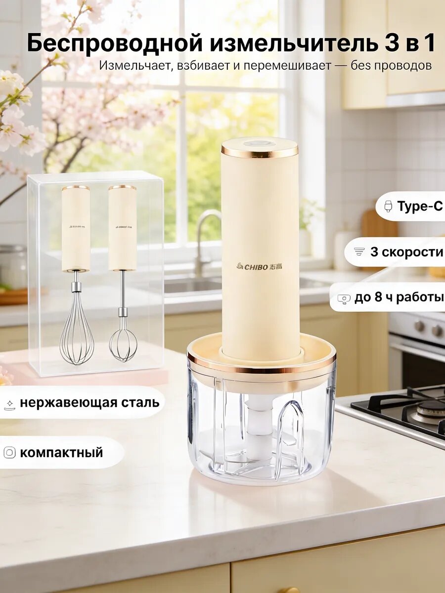 Компактный беспроводной мини-измельчитель на 300 мл с тремя скоростями, зарядкой через Type-C и лезвиями из нержавеющей стали — сочетает функции чоппера, венчика и чаши. Работает без проводов, занимает минимум места на кухне.