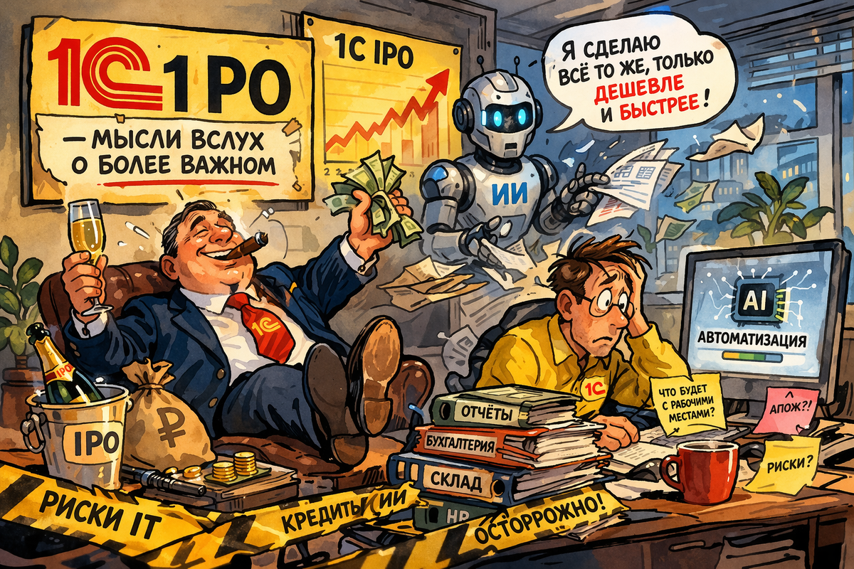Только что где-то промелькнула новость о том, что ведущий российский разработчик софта для ведения корпоративных процессов (продажи, бухгалтерия, закупки, HR, склады... – в общем маленький брат немецкого SAP или американского Oracle) обдумывает выйти на биржу. На фоне моего последнего видео о «Синей Сове» и опасности «тухлых кредитов» IT-сектора возникли нехорошие мысли. Совсем не хочу предвещать беду 1С - с удовольствием сам в прошлом пользовался эти хорошим продуктом! И конечно не хочу вменять собственникам 1С желание «обкэшится» до того, как проблемы из-за ИИ будут нарастать и станут всем очевидны. Может планы по IPO были даже уже давно до проявления этой опасности. Но я не специалист и даже спецам сейчас сложно сказать, чей бизнес ИИ подорвёт, а чей наоборот усилит. Поэтому сама вероятность того, что ИИ может представлять опасность для разработчиков Software, заставляет меня держаться подальше от подобных IPO. Будьте теперь в целом осторожнее с IT отраслью!