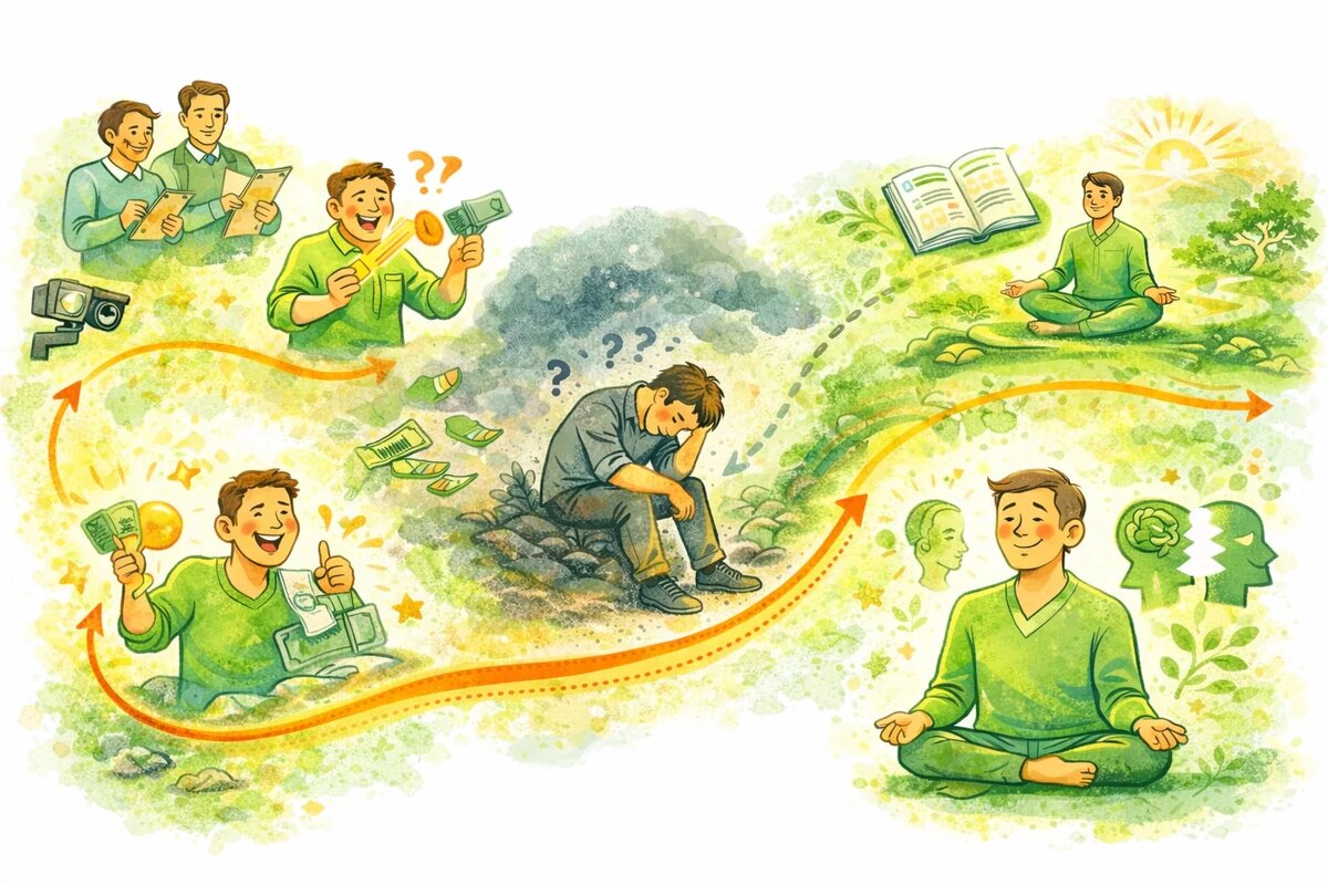 Путь среднестатистического человека на этом графике выглядит как американские горки и проходит через четыре ключевые точки.