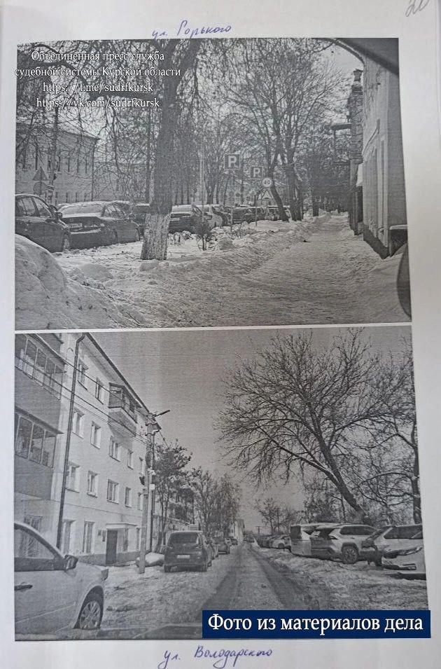 фото - Объединенная пресс-служба судебной системы Курской области Заместителя председателя комитета ЖКХ Курска Дмитрия Падюкова признали виновным в несоблюдении требований по обеспечению безопасности дорожного движения при содержании городских дорог. Нарушения выявило февральское выездное обследование. На улице Марата зафиксировали наличие зимней скользкости в виде снежного наката толщиной 5 см, нормативный срок устранения которого истек. В пределах тротуара, обустроенного по улице Горького, выявили "зимнюю скользкость и уплотненный снег толщиной 11 см". А это недопустимо. - Аналогичные нарушения выявлены и на других улицах Курска: Перекальского, Володарского, Мирной, Ахтырской, Льва Толстого, Никитской, Профсоюзной, Цурюпы, Чапаева, 2-я Восточная, Парижской Коммуны, Калинина, Пушкинской, Железнодорожной, Хуторской, - рассказывает Объединенная пресс-служба судебной системы Курской области. Но комиссия не выявила главного - объективных причин, препятствующих соблюдению требования дей
