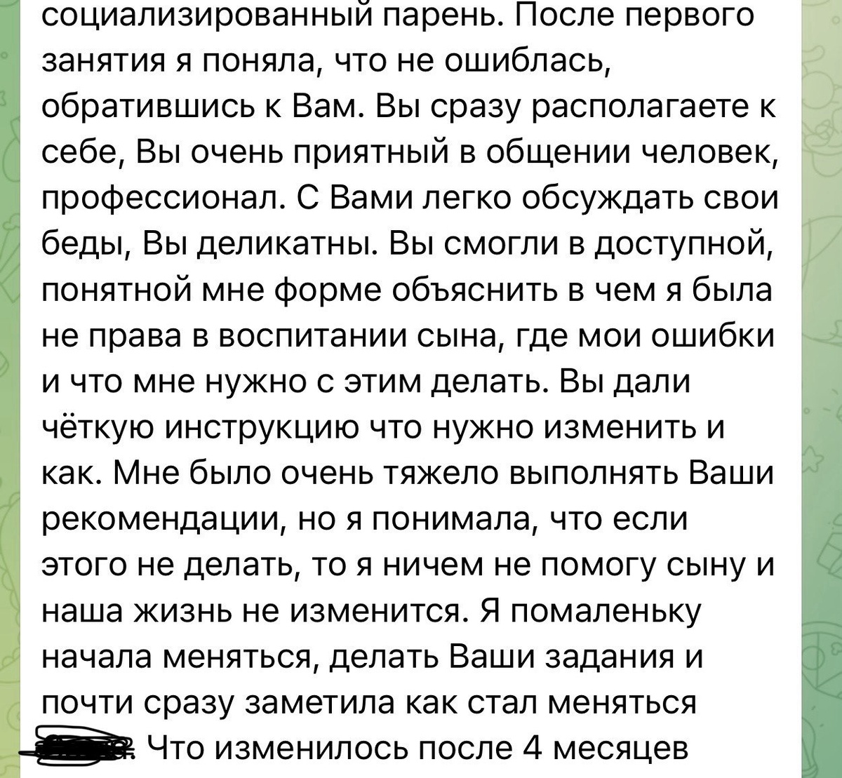 «Полная ремиссия впервые за 5 лет! И я теперь знаю, как хронический стресс плохо влияет на течение болезни»- эти слова мамы подростка можно прочитать ниже в отзыве. «Татьяна, здравствуйте! Я одна воспитываю ребенка. Очень тревожная сама, очень тревожный ребенок. Низкая самооценка у обоих. Оба в хроническом стрессе. У сына тяжелое аутоимунное заболевание. Тяжелое течение. У сына нет друзей, полностью ушел в интернет, учиться не хочет. Профессиональные ориентиры не сформированы. Агрессивное поведение- грубит, хамит» Вот так началось наше общение с мамой. А работа началась с диагностики, как всегда. Я ее провожу с родителями. Конечно, чаще всего это тоже мама. На первой встрече я всегда вижу, где у родителей перекосы в воспитании, где и как они влияют на состояние ребенка. Мне уже на этой встрече становится понятно, что нужно менять в эмоциональном состоянии мамы, в ее убеждениях, в том, как она воздействует на ребенка. Чтобы у него изменилось поведение, отношение к учебе, настроение и да
