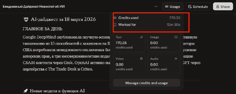 Бонусных 4000 кредитов оказалось так мало, что даже чуть чуть попользоваться функцией не хватит Первое, что мне пришло в голову для чего можно использовать Perplexity Computer это ежедневный мониторинг новостей по ИИ с нужных мне ресурсов и YouTube каналов, ИИ ежедневно проверяет новые статьи и новости, проверяет, что бы не было дублей с прошлым днем и присылает мне в 09-00 свежую подборку Так вот 3 таких отчета съели у меня 770 кредитов, еще 700 кредитов ушло на создание двух простеньких приложений, так что без MAX подписки тут особо не разгуляешься(
