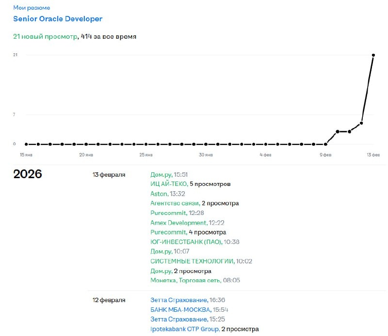 Что там с 15ю откликами? ⏳ 14 февраля, 4 дня с начала эксперимента 1️⃣ Получил 1 отказ - контора находится в Минске, отправил CV на шару. 2️⃣ Два запроса (отклика) прилетело на хрен пойми какие позиции (типа DBA и Delphi). DBA, кстати, за $$ с возможной релокацией во Вьетнам ) 3️⃣ Один отклик - нужен жесткий ЦФТшник и я не прошел по их требованиям (3+ года руководства командой на PL+, например). 4️⃣ Осталось в итоге - два отклика. Эр-телеком и Монетка. Итог поисков с 10.02 (четыре дня): четыре отклика (Банк Авангард, Монетка, Эр-телеком, Узбекский банк). Мой вывод. Раньше (нулевые, десятые) ты не успевал опубликовать резюме - тебя начинали разрывать. Сейчас - стагнация, “отрицательный рост”, “негативный взлёт”, ну, вы поняли. Даже, осенью 2024 года вакансий было гораздо больше и рынок был живой. Рекрутеры написывали и названивали. Напоминаю, что статистика по вакансиям тут https://stats.hh.ru/. Она открытая, берем и смотрим глазками. Как говорится не “Оракл херовый”, а плохо все
