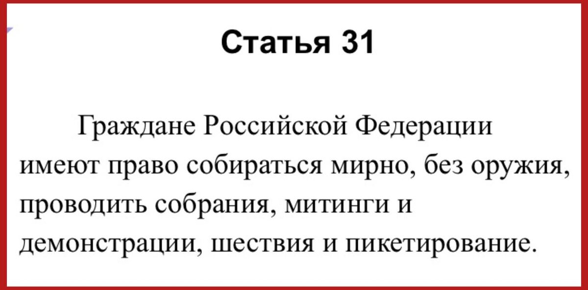 31 Конституции РФ. Хотя, для полноты надо привести ещё текст ст. 56: «Статья 56 1. В условиях чрезвычайного положения для обеспечения безопасности граждан и защиты конституционного строя в соответствии с федеральным конституционным законом могут устанавливаться отдельные ограничения прав и свобод с указанием пределов и срока их действия. 2. Чрезвычайное положение на всей территории Российской Федерации и в ее отдельных местностях может вводиться при наличии обстоятельств и в порядке, установленных федеральным конституционным законом. 3. Не подлежат ограничению права и свободы, предусмотренные статьями 20, 21, 23 (часть 1), 24, 28, 34 (часть 1), 40 (часть 1), 46 - 54 Конституции Российской Федерации» То есть, право, закрепленное в ст. 31, можно ограничить в соответствии со ст 56. Основания прописаны тут же. О чем спорить? Кстати, вот ещё на что обратите внимание: мирное собрание - это право ТОЛЬКО граждан Подпишись на Телеграм Александр Семченко