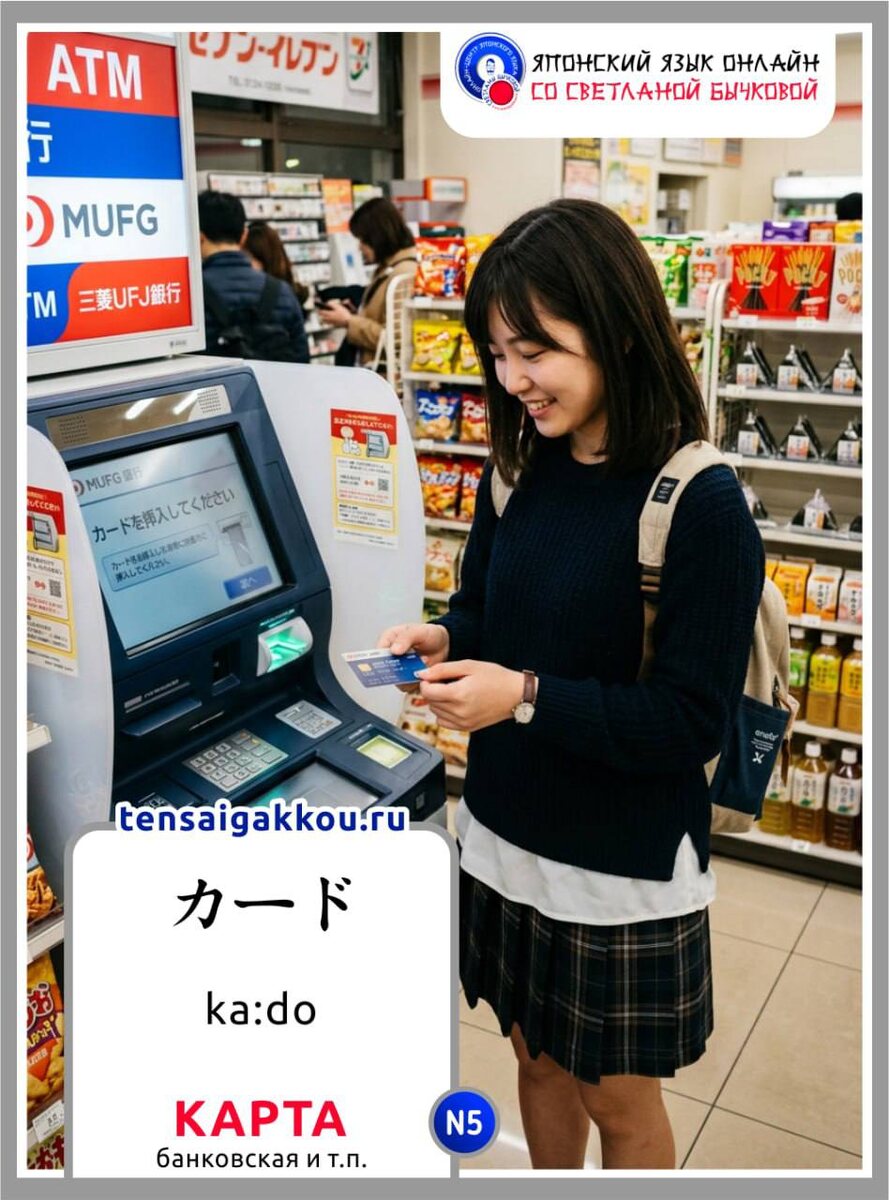 👋☺️Сегодня запоминаем слово カード / ka:do / карта (банковская, бумажная, для игр и т.д.). ✳️ Объяснение значения слова на японском языке (продвинутый уровень): 「カード」は、英語の「card」をカタカナにした外来語で、主に「薄くて硬い、長方形の札」を指します。ロシア語では "карта" または "карточка" と言います。 Примеры предложений: カード ka:do карта (банковская, бумажная, для игр и т.д.). 1. カードで払います。 Ka:do de haraimasu. Я оплачу картой. 2. ここにカードを入れてください。 Koko ni ka:do o irete kudasai. Вставьте карту сюда, пожалуйста. 3. クレジットカードを持っていますか。 Kurejitto ka:do o motte imasu ka? У вас есть кредитная карта? 4. このカードの有効期限はいつですか。 Kono ka:do no yuukou kigen wa itsu desu ka? Когда истекает срок действия этой карты? 🎧Слушайте аудио с этими предложениями на японском языке на моем канале в MAX 👈 Для практики составляйте свои примеры предложений на японском языке и пишите их в комментариях для проверки 👌 🔴🔗Бесплатно записаться на онлайн-курс по запоминанию японской азбуки хирагана