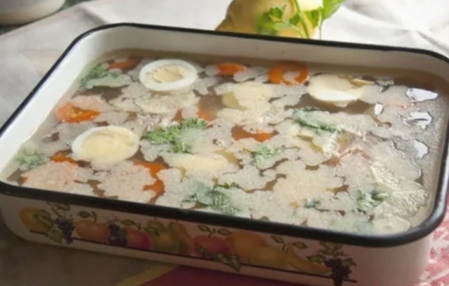 Через 5-6 часов холодец застывал. Бабушка переворачивала форму на плоское блюдо — и выходило произведение искусства. Прозрачный, золотистый, с кусочками моркови внутри.