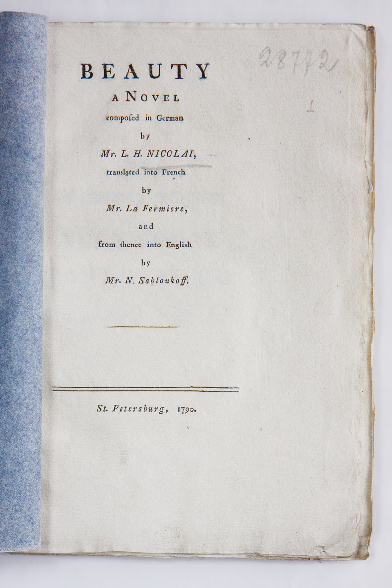 Из подлинных книг Андрея Львовича Николаи в нашем музейном собрании имеется пока единственная – сказка «Красота», изданная в Санкт-Петербурге в 1790 году. Это издание, хотя и прижизненное, далеко не первое. Николаи написал свою поучительную историю о поисках нравственного идеала ещё в те годы, когда занимался воспитанием цесаревича Павла Петровича. В России сказке «Красота» довелось стать самым печатаемым творением Николаи, пожалуй, наравне с его поэмой «Имение Монрепо в Финляндии 1804». К тому же, «Красота» – единственное произведение Николаи, изданное при его жизни на русском языке (оригинальный текст немецкий). Хранящийся в Монрепо экземпляр 1790 года содержит перевод сказки на английский язык. Вряд ли будет заблуждением предположить, что в таком виде «Красота» Николаи вошла в программу обучения уже сына Павла Петровича великого князя Александра Павловича. Английский язык Александру Павловичу преподавал протоиерей Андрей Афанасьевич Самборский (1732–1815), бывший долгое время настоя