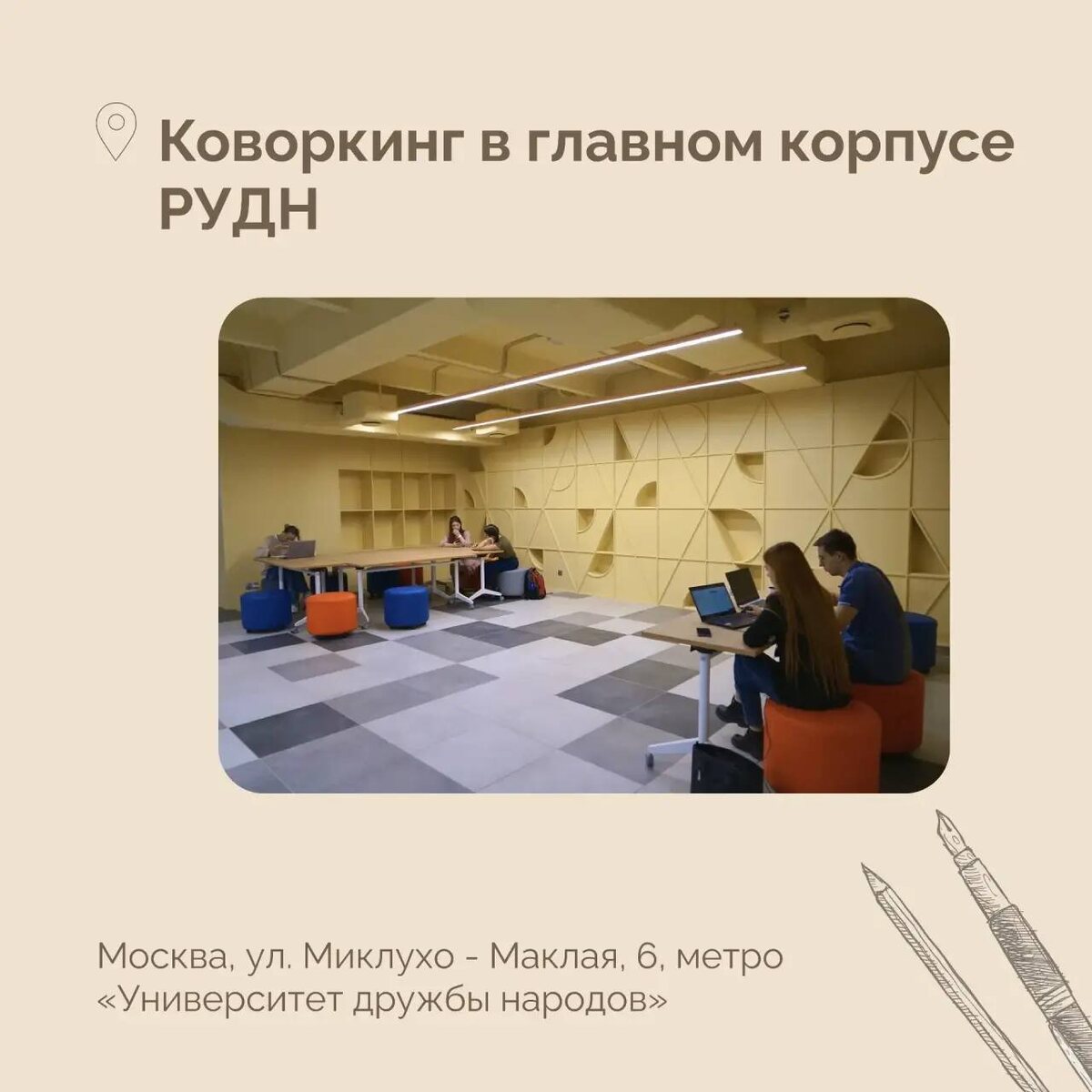 Коворкинг в главном корпусе РУДН Тема: Главное рабочее пространство университета, которое всегда под рукой. 🚇 Станция «Главный корпус» Ноль остановок. Иногда между парами остаётся свободное время, но ехать домой нет смысла. В таком случае есть отличное решение - коворкинг РУДН в главном корпусе. Он находится слева от холла, сразу за стойкой информации. Что внутри🧑🎨: Три зоны по цветам:оранжевая, синяя и желтая. В оранжевой можно устроиться у панорамных окон, в желтой - за удобными столами, а в синей - на круглых скамейках и пуфиках. Wi-Fi ловит везде 🎯 Бонус: есть отдельная застекленная переговорная - зеленая зона. Она с шумоизоляцией, поэтому никто не помешает. Кстати❗️ Раньше ребятам с ограниченными возможностями здоровья было трудно попасть в старый коворкинг у библиотеки. Теперь всё на первом этаже —доступно для всех . Вердикт рубрики: Коворкинг - это лучшее место, чтобы: не терять время между парами, заняться важными д