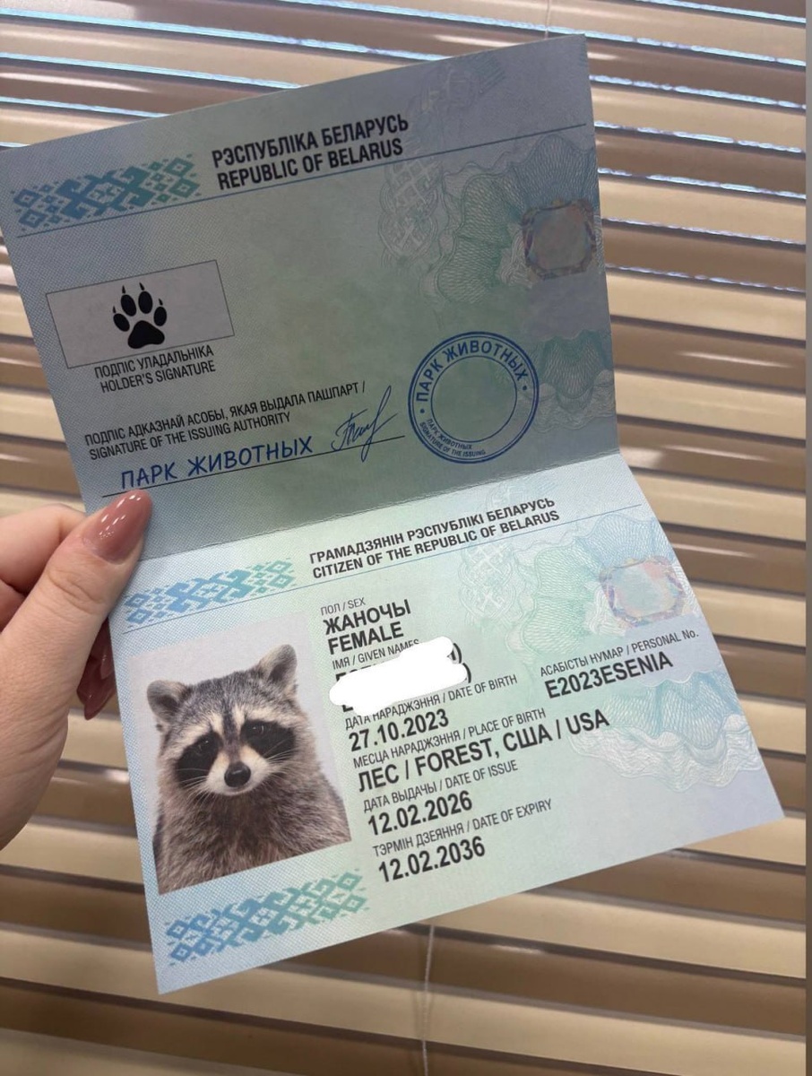 У вас девочка: американский енот Сеня сменил имя и получил новый паспорт Из данных паспорта можно сделать вывод, что енотиха по гороскопу Скорпион, и родилась она в год Водяного кролика по китайскому календарю. 🔴 Читайте Sputnik Беларусь в MAX