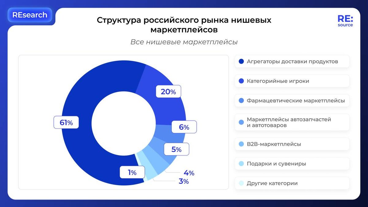 🔹🔹🔹 Аптеки — один из быстрорастущих сегментов нишевых маркетплейсов Больше половины рынка российских нишевых маркетплейсов (61%) занимают агрегаторы доставки. Если смотреть на структуру рынка без них, то лидируют категорийные игроки (51%), онлайн-аптеки (16%) и автомобильные маркетплейсы (13%). Фармацевтическая ниша показала высокий темп роста в прошедшем году — +44%. При этом динамика всего рынка маркетплейсов оказалась в два раза меньше — +22% в 2025 году. Источник: Т-Бизнес, Data Insight (рус) #REsearch Подписаться на RE:source