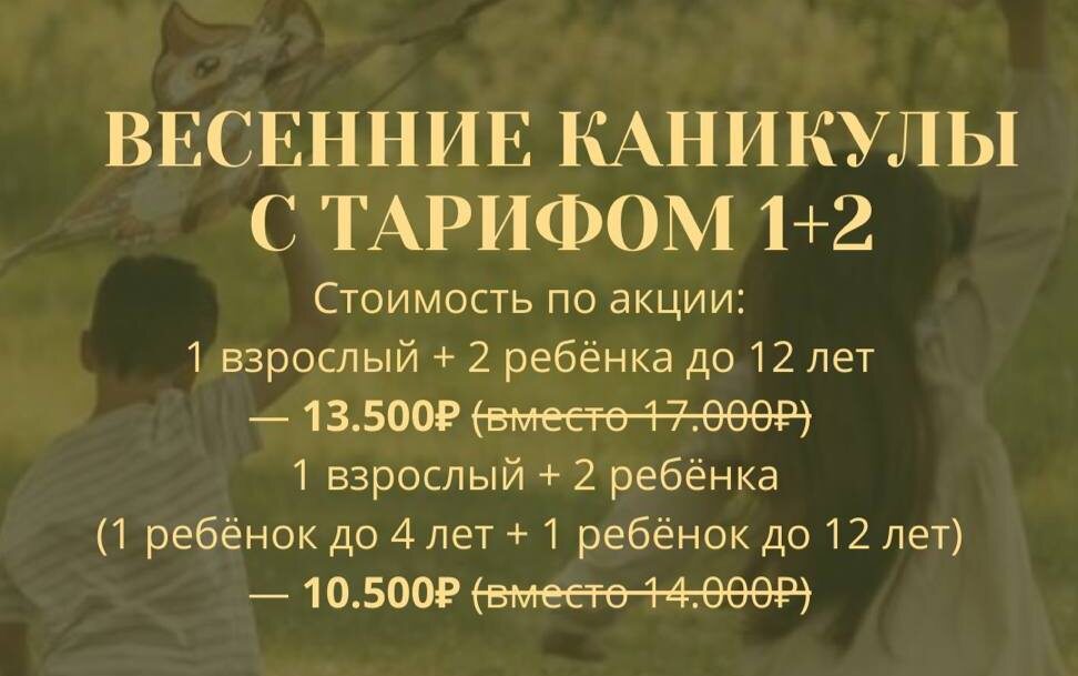 Весна – время пробуждения природы и долгожданных школьных каникул! А что может быть лучше, чем провести это время всей семьей, наслаждаясь отдыхом и новыми впечатлениями? Гостиничный комплекс "Дворцы" приготовил для вас идеальное решение – весенние каникулы с детской анимацией! С 23 марта по 4 апреля мы приглашаем вас окунуться в атмосферу комфорта и веселья, где каждый найдет себе занятие по душе. Пока вы наслаждаетесь заслуженным отдыхом, ваши дети будут заняты увлекательными активностями под присмотром опытных аниматоров. Что ждет ваших детей в "Дворцах"? Пока дети весело проводят время, у вас будет возможность посвятить его себе. Отдохните в SPA-центре, посетите баню или просто насладитесь тишиной и покоем. Мы уверены, что вы по достоинству оцените возможность отдохнуть от повседневных забот и перезагрузиться. Специальное предложение для семейного отдыха: Чтобы сделать ваш отдых еще более приятным, мы предлагаем специальный тариф "1+2" – для 1 взрослого и 2 детей. Это отличный спо