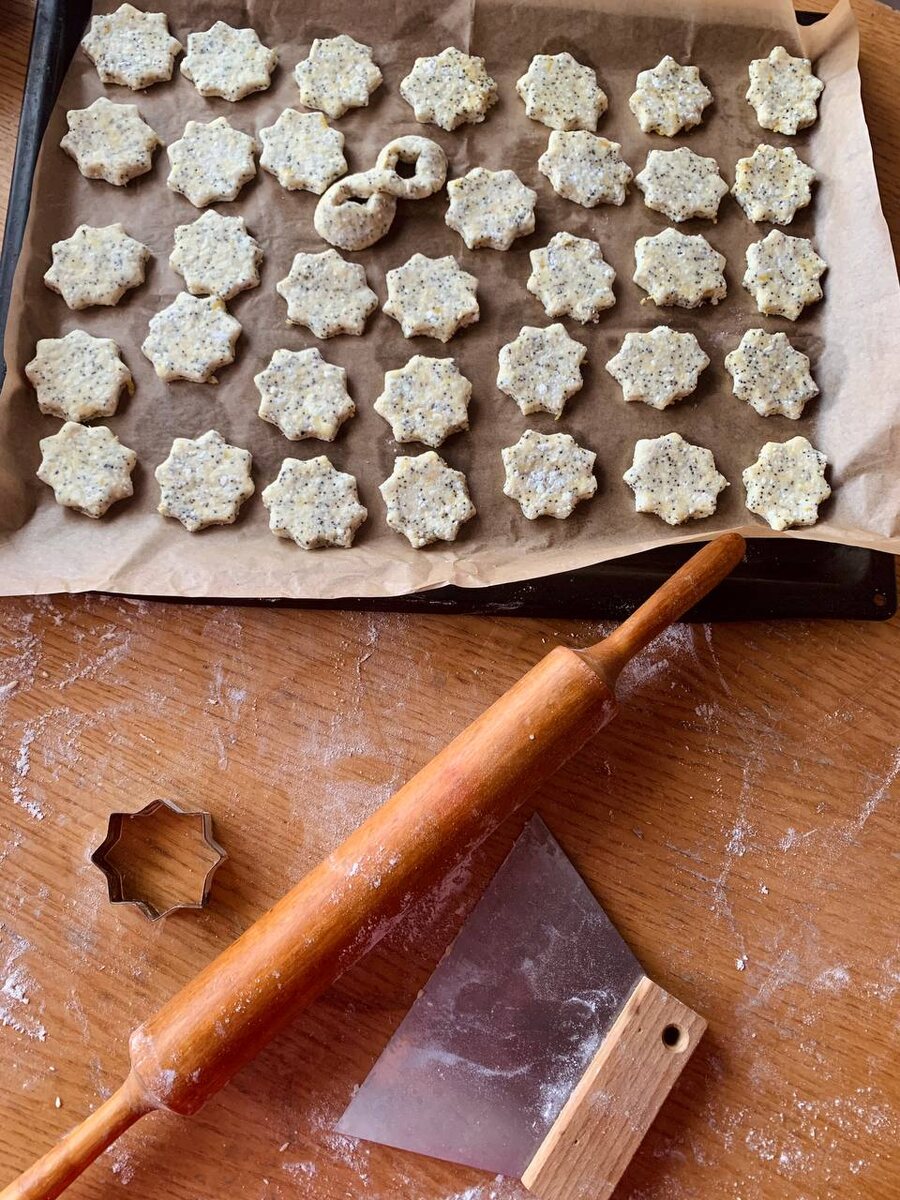 ) Ингредиенты: • 200 г творога • 100 г мягкого сливочного масла (или 80 г растительного) • 160–180 г муки • 2–3 ст. л. сахара • щепотка соли • цедра лимона, мак — по желанию ⸻ Приготовление 1. Духовку сразу включи 180 °C. 2. В миске вилкой разотри творог с маслом. 3. Добавь сахар, соль и цедру. 4. Подмешай муку — должно получиться мягкое, чуть липкое тесто. 5. Раскатай в пласт 0,5-0,8 см шириной, вырубкой нарежь заготовки и выложи на противень. Выпекать 12–15 минут. ⸻ Что получится • сверху лёгкая корочка • внутри нежная творожная рассыпчатость • аромат лимона делает его очень «кондитерским» Приятного аппетита ❤️