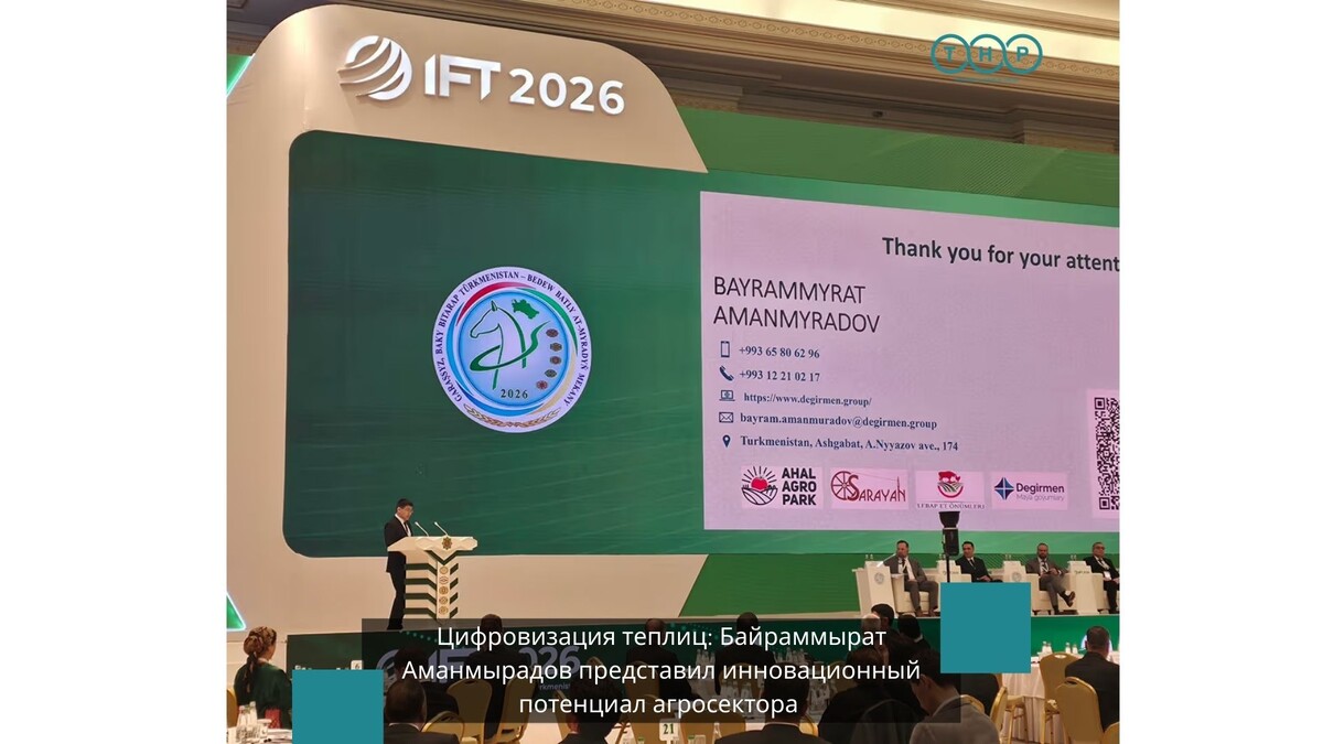 На Международном инвестиционном форуме «Инвестиции в будущее Туркменистана» (IFT 2026) выступил Байраммырат Аманмырадов — заместитель председателя Ашхабадского городского комитета Партии промышленников и предпринимателей, директор ХО «Degirmen Topary». В своем докладе он представил практический опыт развития высокотехнологичного агробизнеса на примере тепличного комплекса AHAL AGROPARK. Спикер подчеркнул, что в последние годы в Туркменистане сформирована уникальная среда для частного сектора, включающая упрощенное налогообложение со ставкой 2% от оборота, нулевой НДС на экспорт и освобождение производственного оборудования от таможенных пошлин. Эти меры, дополненные предоставлением земли в долгосрочную аренду и льготным кредитованием, создают устойчивую платформу для реализации амбициозных проектов. Особое внимание было уделено технологическому оснащению комплекса AHAL AGROPARK, расположенного в Каахкинском этрапе Ахалского велаята. На площади 15 гектаров ежегодно производится около 20