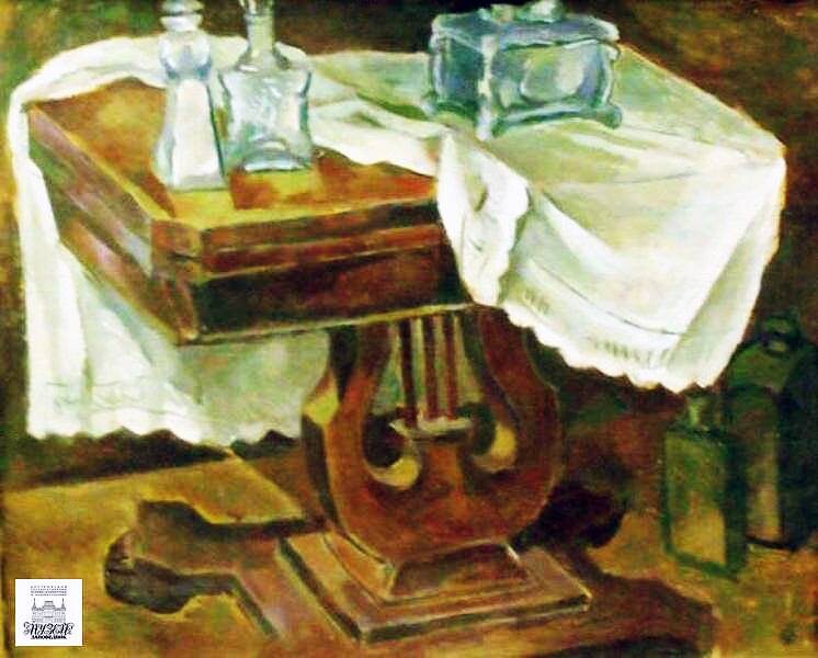 Николай Пшизов. СТЕКЛО НА СТОЛЕ. Картон/масло. 80-е годы. Из собрания костромского музея заповедника. Дар сына художника.