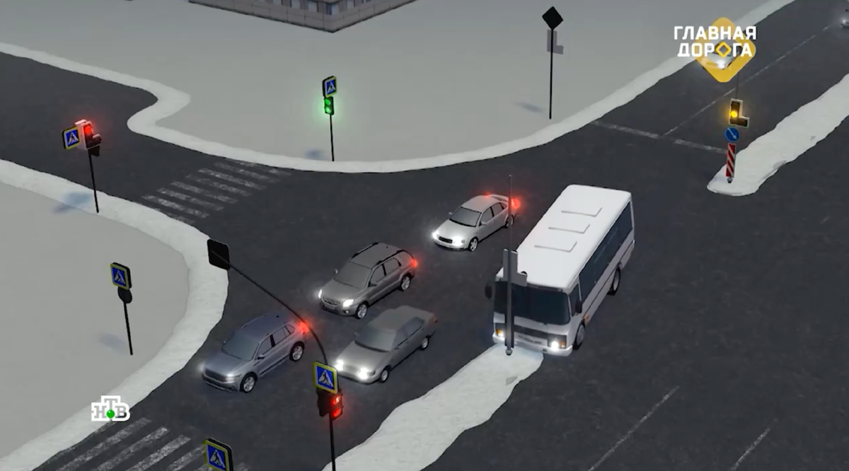 Легковушка перестраивалась из правого ряда в левый. Чтобы избежать столкновения, водитель автобуса принял левее и врезался в столб на разделительной полосе. Кто виноват в ДТП?