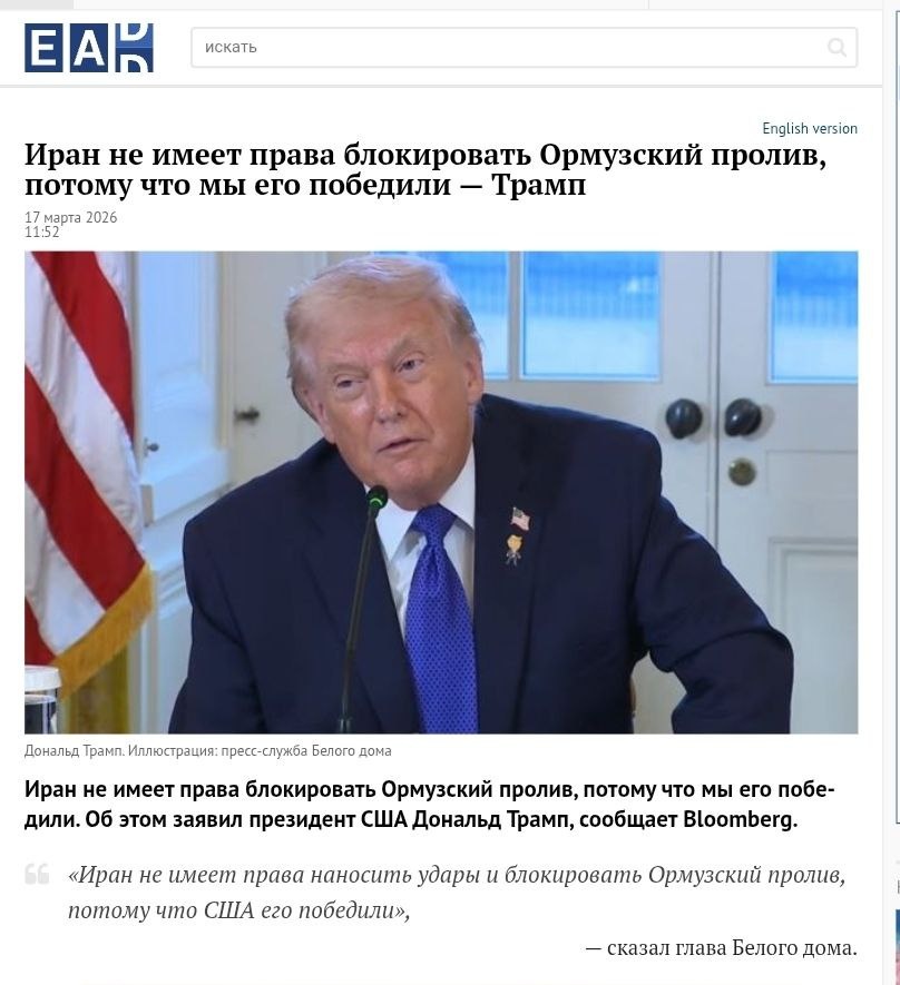 победил в драке/разборке – тот и диктует "правила". Его фраза о том что "Иран не имеет права наносить удары и блокировать Ормузский пролив, потому что США его победили" - характерный образчик понятий указанных сообществ, раскрывающий основу и мотивацию их действий. У кого сила – тот и на коне. Сила физическая, в количестве кулаков и оружия, а особенно в разнообразии и видах последнего: если ядерное – то тут вообще "реальные пацаны" обходятся без всяких сентиментальностей ненужных в виде пресловутого "международного права". И, кстати, Трамп для России выгоден. Скрин сделан со страницы: https://eadaily.com/ru/news/2026/03/17/iran-ne-imeet-prava-blokirovat-ormuzskiy-proliv-potomu-chto-my-ego-pobedili-tramp
