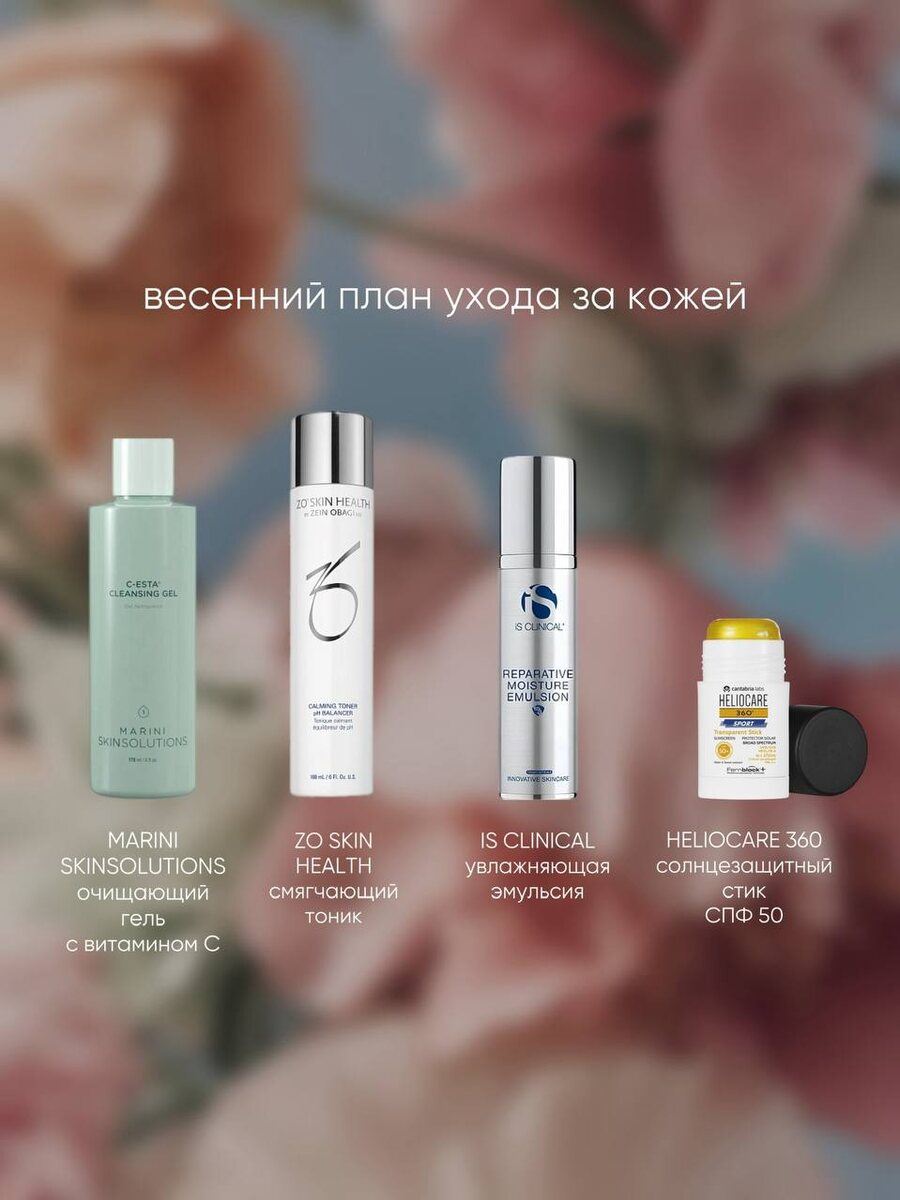 ? MARINI SKINSOLUTIONS C-ESTA CLEANSING GEL очищающий гель с витамином С и DMAE - обеспечивает деликатное очищение от загрязнений, осветляет гиперпигментацию и улучшает цвет лица, устраняет куперозную сетку и укрепляет сосудистые стенки, защищает эпидермис от обезвоживания ZO SKIN HEALTH CALMING TONER PH BALANCER смягчающий тоник для восстановления PH - устраняет воспаления, снимает раздражение, успокаивает кожу IS CLINICAL REPARATIVE MOISTURE EMULSION увлажняющая эмульсия - увлажняет и разглаживает кожу, уменьшает поверхностные и глубокие морщины, предотвращает повреждение ДНК HELIOCARE 360 SPORT TRANSPARENT STICK SPF50+ солнцезащитный стик - оказывает мощное антиоксидантное, восстанавливающее и успокаивающее действие, нейтрализует урон, наносимый солнечным излучением МЫ В МАКС