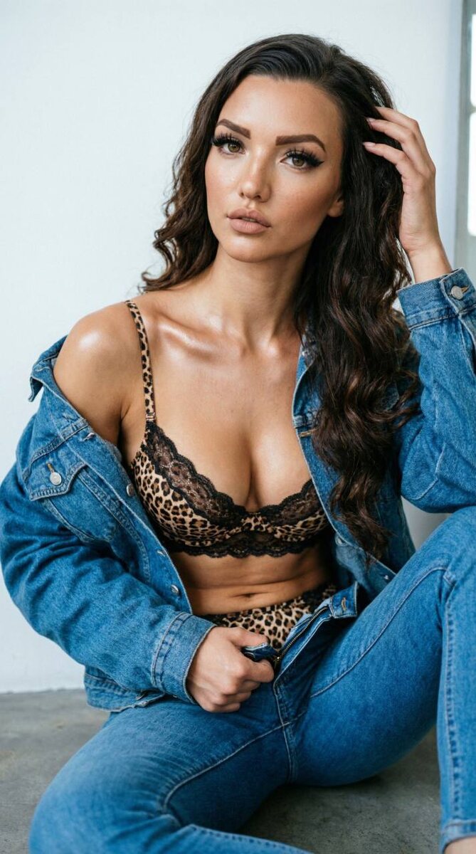 🤭 Пробуйте 🥰 все работает Показывайте что получится . Using the uploaded reference photo, keep facial features, bone structure, skin tone 100% identical to the original. Vertical 2:3, medium shot from slightly above, iPhone 3x realistic look. Girl sitting on studio floor against wall, legs bent. One hand holds unbuttoned jeans at zipper, slightly pulling down, second hand in hair. Oversized denim jacket falling off плечо, под ней видно леопардовое кружевное белье (бра + трусы). Фигура подтянутая, акцент на ключицах и груди с влажным хайлайтером (лицо матовое). Волосы длинные, мягкие волны. Макияж: четкий контуринг, стрелки, густые ресницы, нюд матовые губы. Мягкий естественный свет как из окна, реалистично, высокая детализация, без пластика. И реакций насыпьте Кристинке💋