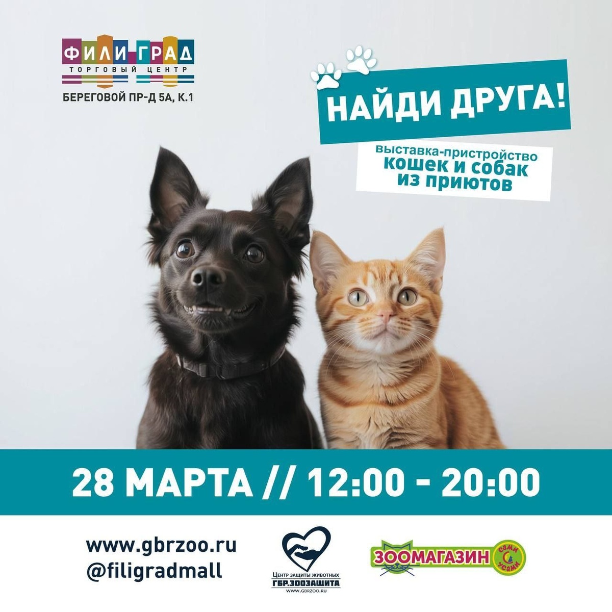 ! Приглашаем вас на благотворительное,семейное мероприятие - выставку - пристройство животных из приютов "Найди друга!" Самые красивые, добрые, умные, социализированные кошки, котята, собачки и щеночки будут ждать своих хозяев на выставке в субботу 28 марта! Все животные привиты, прошли ветеринарный контроль и готовы ехать домой (не забудьте свой паспорт)! Если вы пока не готовы взять пушистого питомца в дом, вы можете принести или купить в зоомагазине «Сами с Усами» котикам вкусные подарки, корма, лежанки, игрушки, сделать финансовые пожертвования или помочь любым возможным способом! Все средства пойдут на помощь нуждающимся животным и животным из приютов! Хорошее настроение, море позитива и теплых эмоций от общения с добрейшими животными из приютов гарантировано! Приходите всей семьей ! Когда: 28 марта 2026 года (суббота) с 12.00-20.00 Где: ТЦ «Фили Град», 1 этаж Адрес: г. Москва, Береговой поезд, дом 5А, корпус1, 1 этаж Метро «Фили» 16 мин пешком 3 мин на автобусе 109, 116, 653, 653