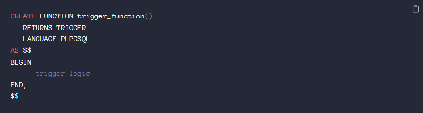 Сама триггерная функция похожа на обычную пользовательскую функцию, однако не принимает аргументов и возвращает данные типа trigger.
