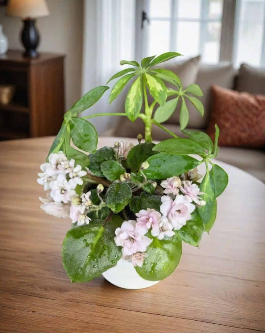 В прошлом году я отстригла от своей Шеффлеры пару черенков, корректируя её форму. Взрослая Шеффлера у меня давно живет, уже много лет. Досталась она мне году в 2014 примерно уже взрослой и с раскоряченной странной формой. Ветки у нее росли две основные в разные стороны, как раскинутые руки. Вот сперва я обрезала их и ждала нового обрастания. Потом корректировала форму еще не раз. И вот в прошлом году после обрезки укоренила пару её черенков. Они стали участниками технических коллективных посадок в рамках моей программы по сокращению мелких горшочков. Ну не люблю я мелкие емкости. Мне лучше посадить всех кучей в одну, чем стопроцентно пропустить какой-то мелкий горшок при поливе и он засохнет. Вот по этой причине я ссадила оба черенка Шефлеры с разными другими растениями. Вот так выглядела посадка с фиалкой))) Еще вчера этот горшочек выглядел вот так: Шеффлера сильно выросла, но с Фиалкой они прекрасно ладили, никто никого не обижал. А второй черенок был посажен с Рео и Эписцией: Все Ш
