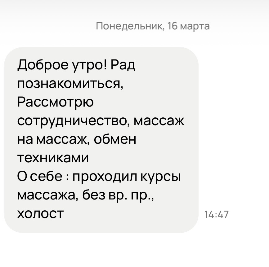 Учитывая, что в объявлении у меня четко указан и мой опыт, и цены, и виды массажа, уровень самоуверенности зашкаливает.