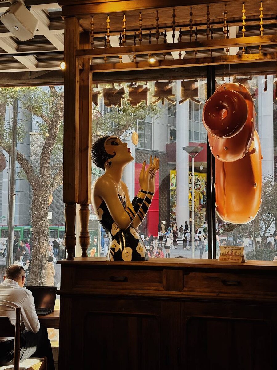 Среди небоскребов и бесконечных торговых центров Нанкин-роуд затерялось уютное местечко, где пахнет свежей выпечкой и царит атмосфера старого Нью-Йорка. BEIGEL TREE — это не просто пончиковая, а настоящий портал в Америку 1950-х, стилизованный под "Нью-Йоркский музей бейглов". Интерьер здесь продуман до мелочей. Это не просто кафе, а инсталляция американской мечты: Все это создает ощущение, что ты не в Шанхае, а где-то в Бруклине или на улочках старого Нью-Йорка. Очень уютно и фотогенично 📸 Главное блюдо здесь, конечно, бейглы. Они свежайшие, пекут прямо при тебе, используя традиционные рецепты и качественную муку . Что рекомендуют в отзывах: 🥑 Классические — с яйцом, беконом, сыром 🐟 С лососем и сливочным сыром (очень хвалят!) 🍫 Сладкие — с шоколадной пастой, арахисовым маслом, фруктами, маршмеллоу 💰 Цены: бейглы — от 20 до 50 юаней Я просто влюбилась в это место. Очень уютно, атмосферно и безумно вкусно. Бейглы свежайшие, тесто мягкое, начинка сочная. Сладкие варианты — отдельна