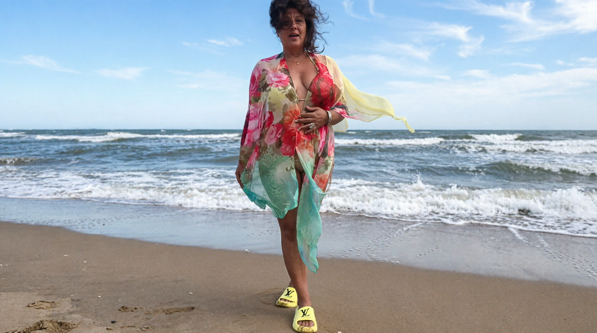 Жёлтые тапочки с логотипом — не просто мода. Жёлтый — цвет солнечного сплетения, интуиции, радости. Но они — обувь для дома, а вы стоите на пляже. Это говорит о том, что вы готовы к легкости, но пока не отпустили привычную опору. Вы всё ещё в «домашнем режиме» даже на свободе.