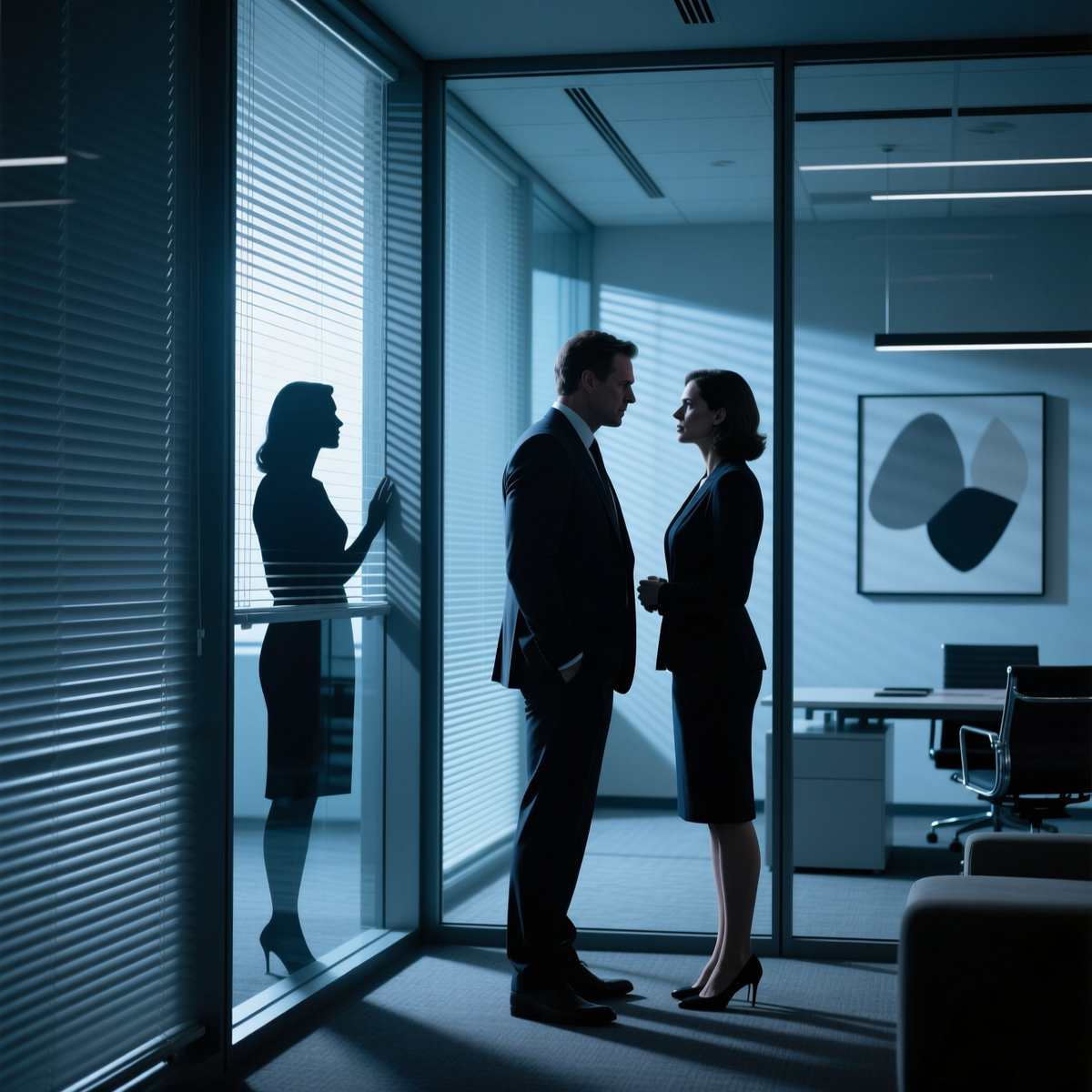 Открыла через тридцать секунд. Антон стоял у окна, поправлял галстук. Она — за столом, волосы чуть растрёпаны.